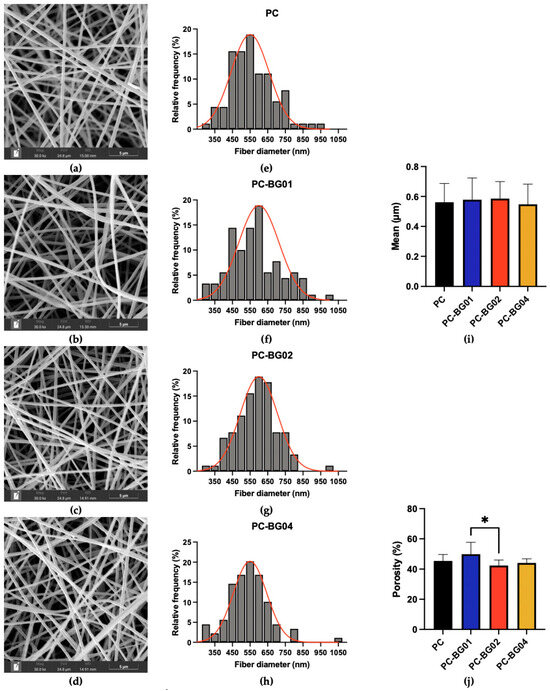 SEM images of (a) PC, (b) PC-BG01, (c) PC-BG02, and (d) PC-BG04 scaffolds (scale bar: 5 µm) corresponding with histogram of fiber diameter distributions (e–h), the red line represents the fitted distribution curve of fiber diameters. (i) Average fiber diameters of scaffolds (n = 90, mean ± SD). (j) Percentage porosity of scaffolds (n = 9, mean ± SD). * Indicates statistically significant differences between groups (p < 0.05).