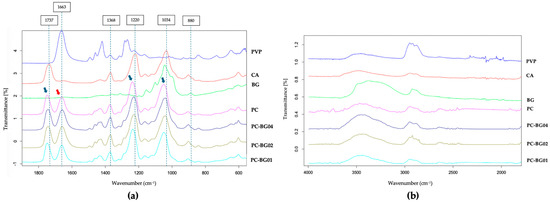 FTIR spectra of PVP/CA blended scaffold (PC), and BG-coated scaffolds (PC-BG01, PC-BG02, and PC-BG04), along with raw materials (PVP, CA, and BG powders). (a) Spectra from 2000 to 400 cm−1 and (b) spectra from 4000–1500 cm−1.