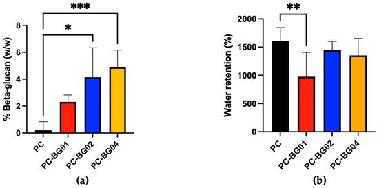 The beta-glucan detected values for PC, PC-BG01, PC-BG02, and PC-BG04 were 0.20 ± 0.64%, 2.31 ± 0.51%, 4.10 ± 2.20%, and 4.89 ± 1.27%, respectively (n = 3). Statistically, PC-BG02 and PC-BG04 contained significantly higher levels of beta-glucan compared to the PC group (p < 0.05, Kruskal–Wallis test), while no significant differences were observed among the BG-coated groups (Figure 4a).