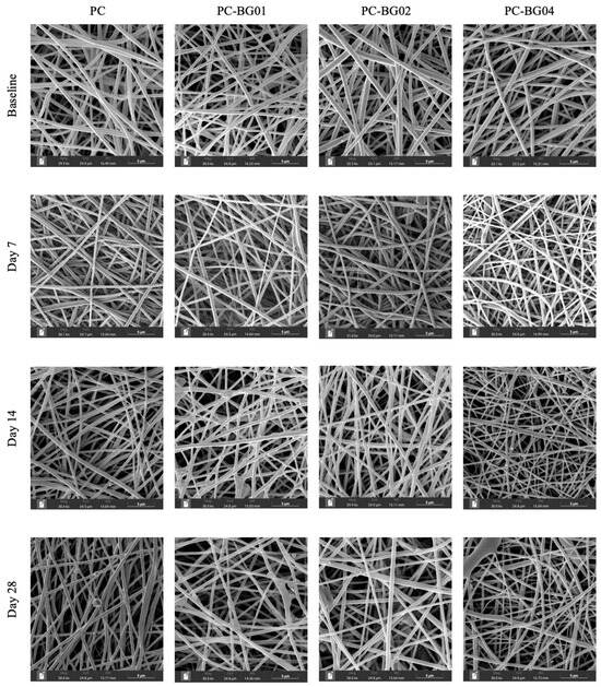 SEM images of scaffolds from all groups at different time points (baseline, 7, 14, and 28 days) after immersion in PBS and air-drying. Images were captured at comparable magnifications. Scale bar: 5 µm.