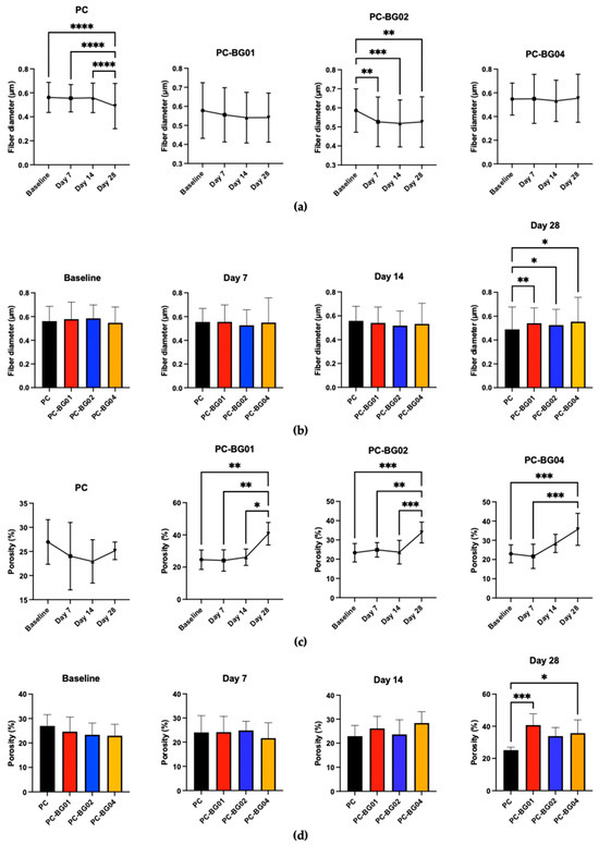 Physical changes in PC and BG-coated scaffolds over 28 days of PBS immersion followed by air-drying. (a) Fiber diameter distribution at each time point (baseline, 7, 14, and 28 days) (mean ± SD, n = 90). (b) Average fiber diameter across groups over time (mean ± SD, n = 90). (c) Porosity measurements at each time point (mean ± SD, n = 9). (d) Time-dependent changes in porosity for each scaffold group (mean ± SD, n = 9). (e) Dry weight changes in scaffolds after immersion (mean ± SD, n = 9). Statistical significance between groups is indicated as * (p < 0.05), ** (p < 0.01), *** (p < 0.001), and **** (p < 0.0001).