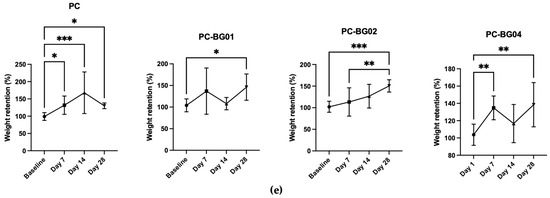 Dry weight of the scaffolds was measured at each time point following complete air-drying. Both the PC and PC-BG04 groups showed a significant increase in dry weight within the first 7 days (n = 9, p < 0.05, Kruskal–Wallis test), with no further significant changes from day 7 to day 28. The PC-BG01 group exhibited a significant increase in dry weight at day 28 compared to baseline, with no other significant differences. In the PC-BG02 group, dry weight significantly increased at day 28 compared to both baseline and day 7 (Figure 7e).