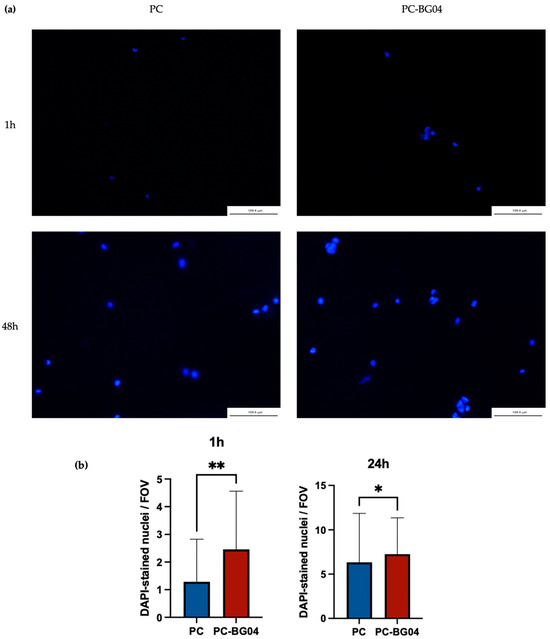 DAPI staining confirmed the ability of hAPCs attaching to both PC and PC-BG04 scaffolds surfaces at both 1 and 48 h post-seeding. At 1 h, scattered nuclei were observed, indicating initial cell attachment. By 48 h, a greater number of nuclei were visible on the scaffold surface, suggesting continued cell retention or proliferation over time (Figure 8a). Quantitative analysis demonstrated the significant increase in cell attachment on the BG-coated scaffold compared to the PC scaffold in both 1 and 24 h (n = 3, p < 0.05, Kruskal–Wallis test) (Figure 8b).