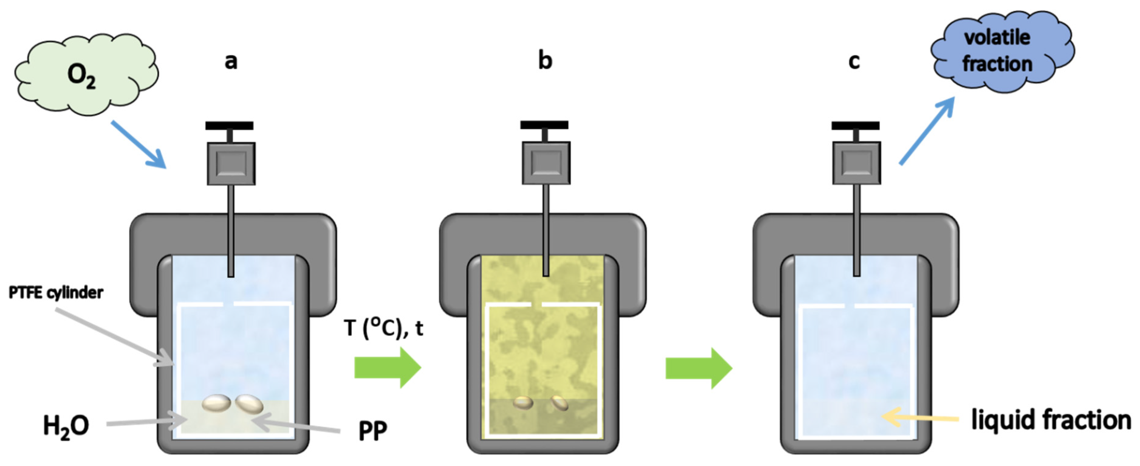 - Xu, Q.; Wang, Q.; Yang, J.; Liu, W.; Wang, A. Recovering Valuable Chemicals from Polypropylene Waste via a Mild Catalyst-Free Hydrothermal Process. Environ. Sci. Technol. 2024, 58, 16611–16620. [Google Scholar] [CrossRef]