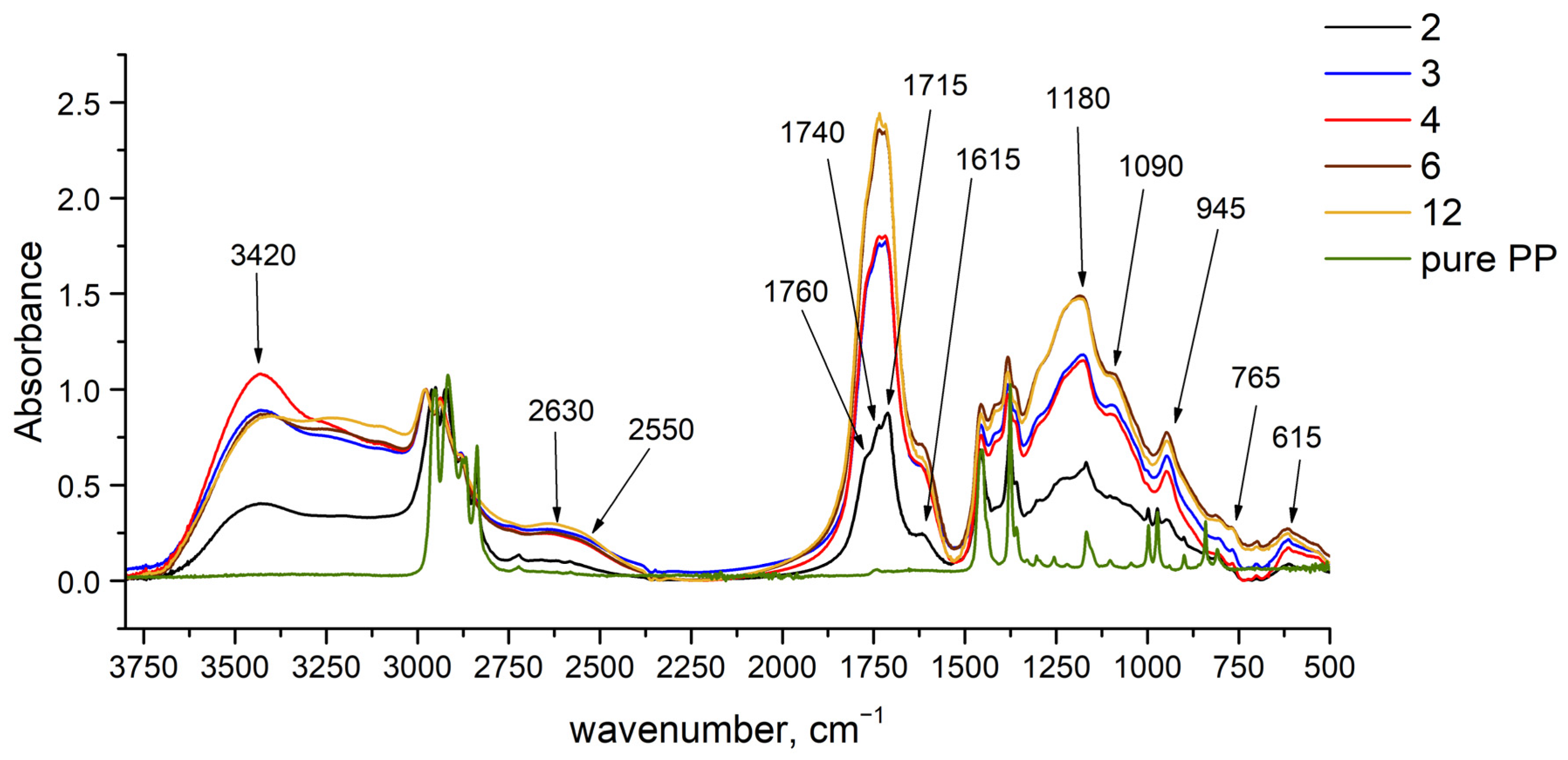 Zefirov, V.V.; Kazaryan, P.S.; Stakhanov, A.I.; Stakhanova, S.V.; Ilyin, M.M.; Godovikov, I.A.; Shmakova, E.V.; Terentyev, A.G.; Dudkin, A.V.; Kharitonova, E.P.; et al. Kinetics of Carboxylic Acids Formation During Polypropylene Thermooxidation in Water Saturated with Pressurized Oxygen. Polymers 2025, 17, 2696. https://doi.org/10.3390/polym17192696
