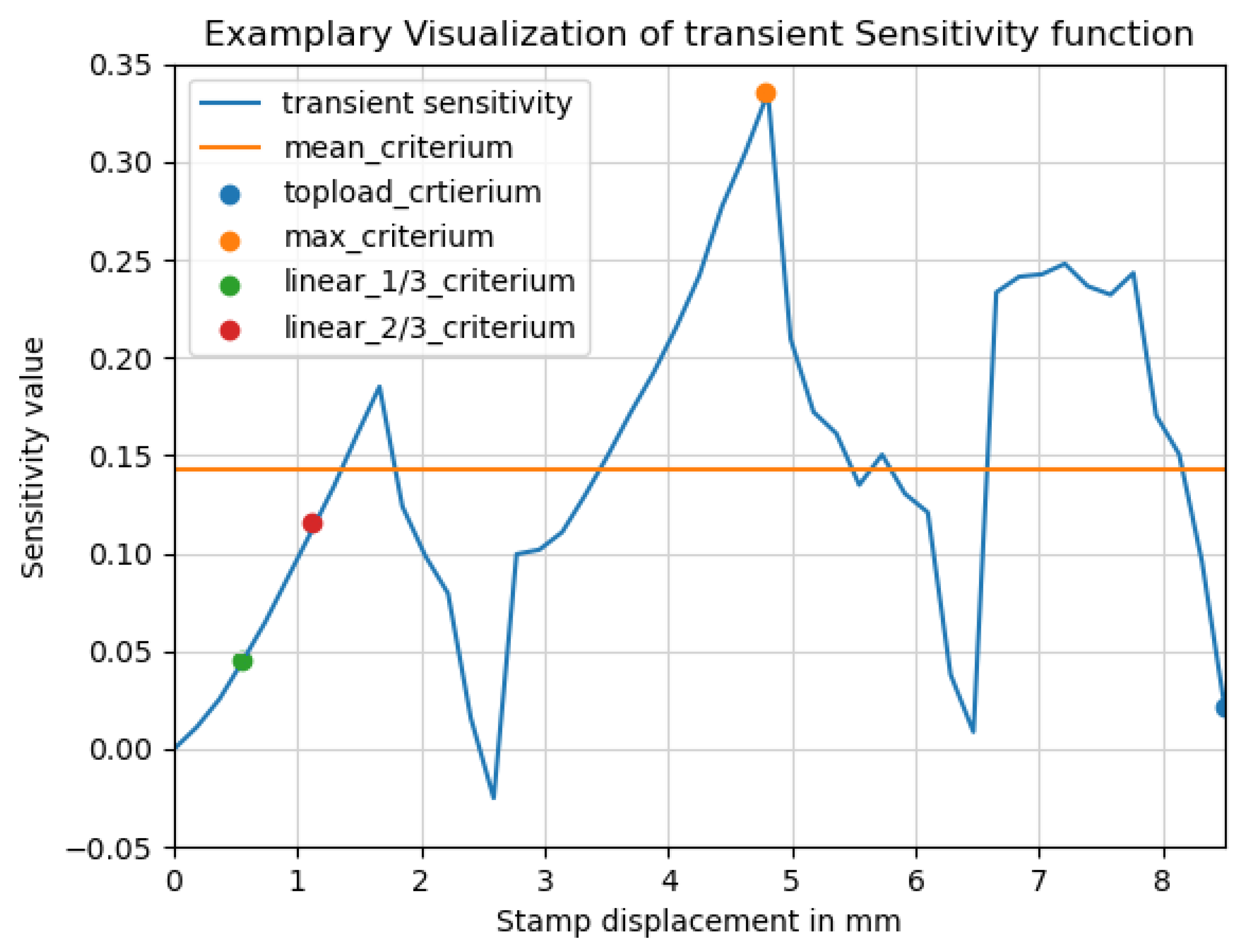 Figure 3. The x-axis represents the stamp displacement, while the y-axis shows the corresponding sensitivity values. This transient sensitivity function has to be reduced to a scalar value so this information can be used in an optimization procedure. In order to reduce it, various extraction schemes have been developed. Their names and the values that the methods achieve are marked in the figure. In the following paragraphs, these schemes are described in more detail.