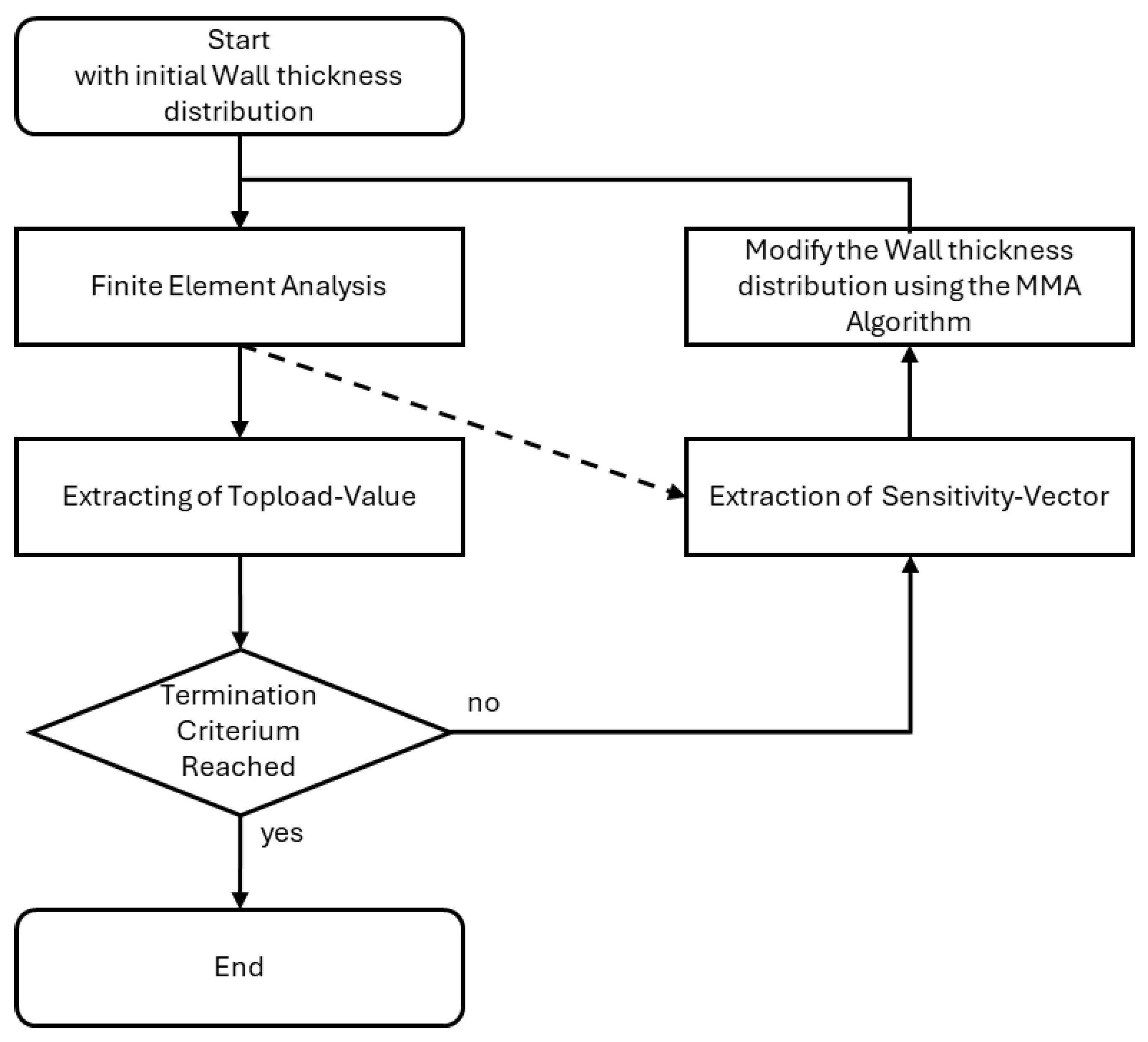 Figure 4). It starts with a predefined wall thickness distribution, which can be uniform or nonuniform. As a first step, the Finite Element Problem is solved. Routines were implemented that continuously check whether the top-load has been reached in the running simulation. If that is the case, the simulation is terminated as all the information necessary for the optimization has been calculated. For this purpose, the top-load condition was defined as the state just before the load drops by 3%. The achieved top-load value is then extracted from the FEM results database and represents the objective functions outcome which is to be maximized.