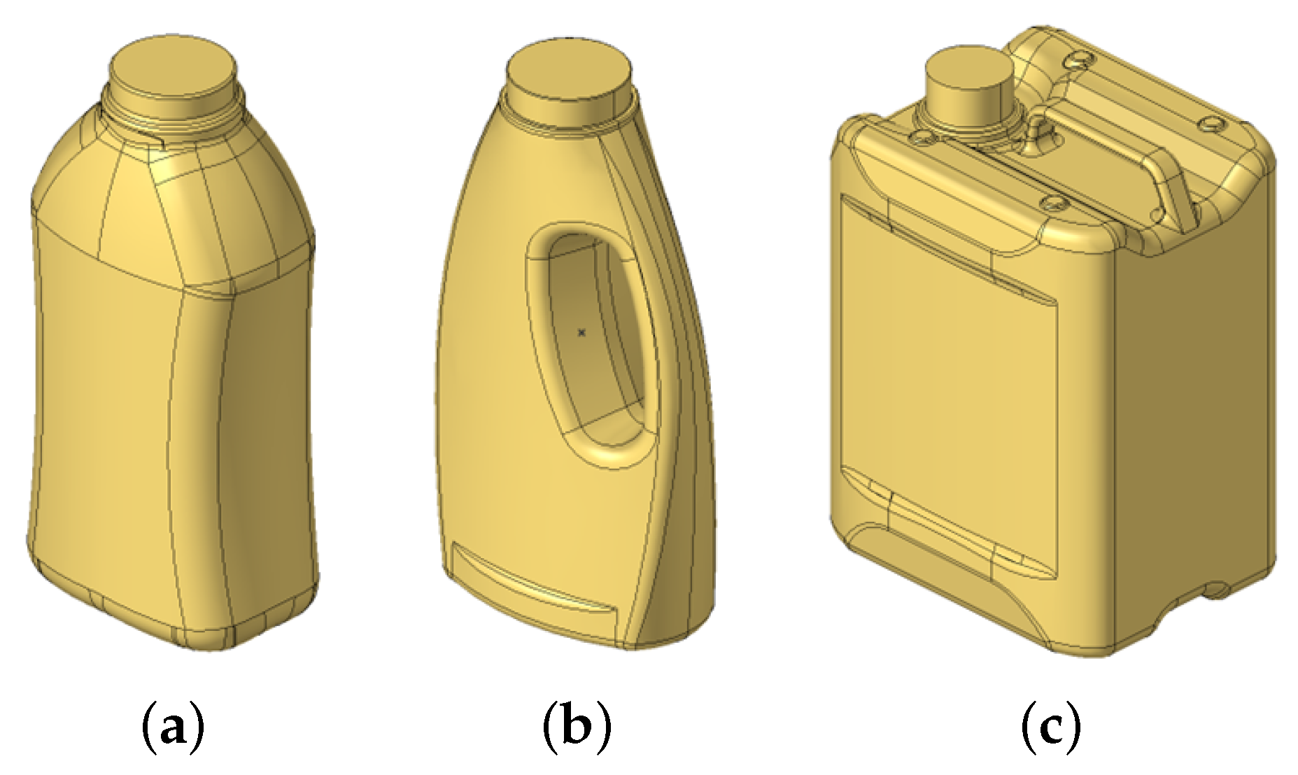 In addition to geometry, the internal liquid capacity and specified product mass differ among the models. The liquid volume was selected so that each container would be mostly filled, leaving only a small amount of air. A specific product mass was chosen based on consultation with experienced blow-molding machine operators and product designers. Based on the surface area of each product, the desired mass, and the density of high-density polyethylene (HDPE), a constant wall thickness distribution was calculated. This uniform distribution served as the starting point for all subsequent optimizations.