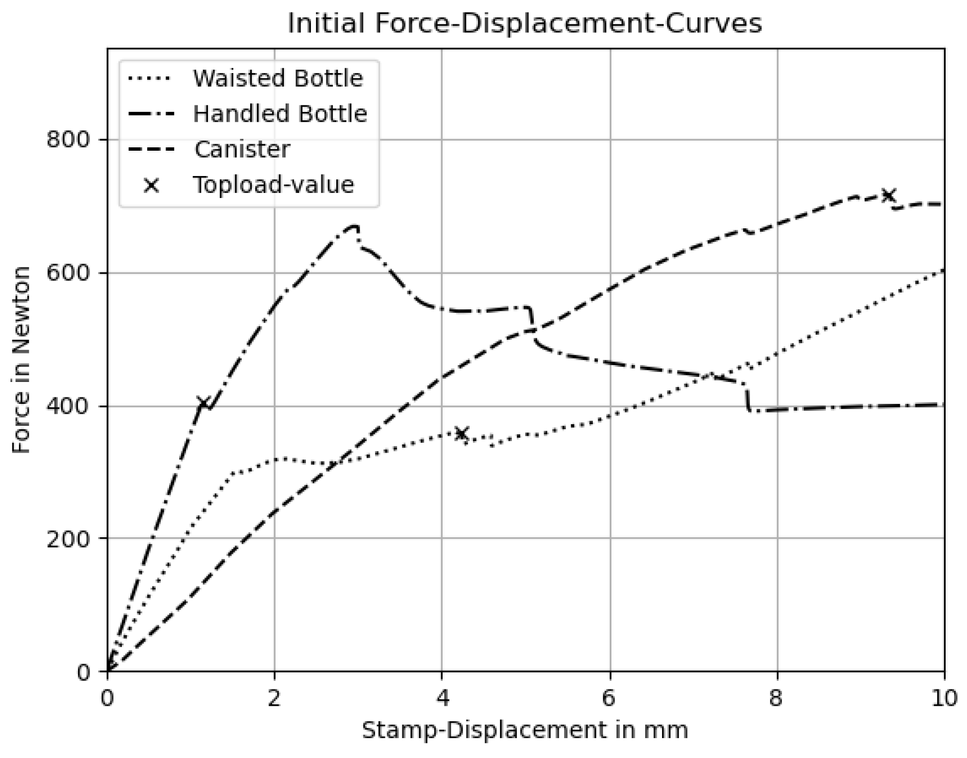 The initial slope of the compression curve became noticeably steeper after applying the linear optimization scheme, indicating increased stiffness during the early stages of loading. However, this increase in stiffness did not generally lead to improved top-load values. A notable exception was observed in the handled bottle, where the top-load force increased by approximately 50%. Further analysis revealed that the load drop responsible for triggering the top-load criterion in the unmodified bottle was significantly reduced in the optimized version. This behavior is considered an outlier, and the assumption that increased stiffness would consistently result in higher top-load values did not hold in general.