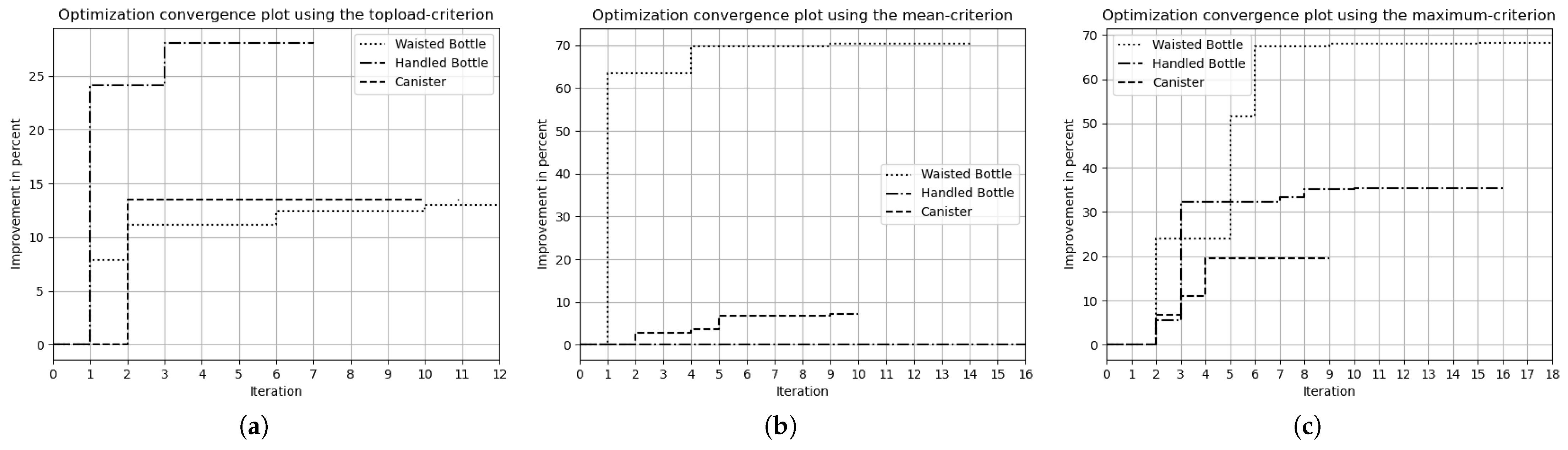 maximum criterion yielded improved wall thickness distributions for all three products. However, convergence toward the optimum required more iterations compared to the optimization using the top-load criterion (see