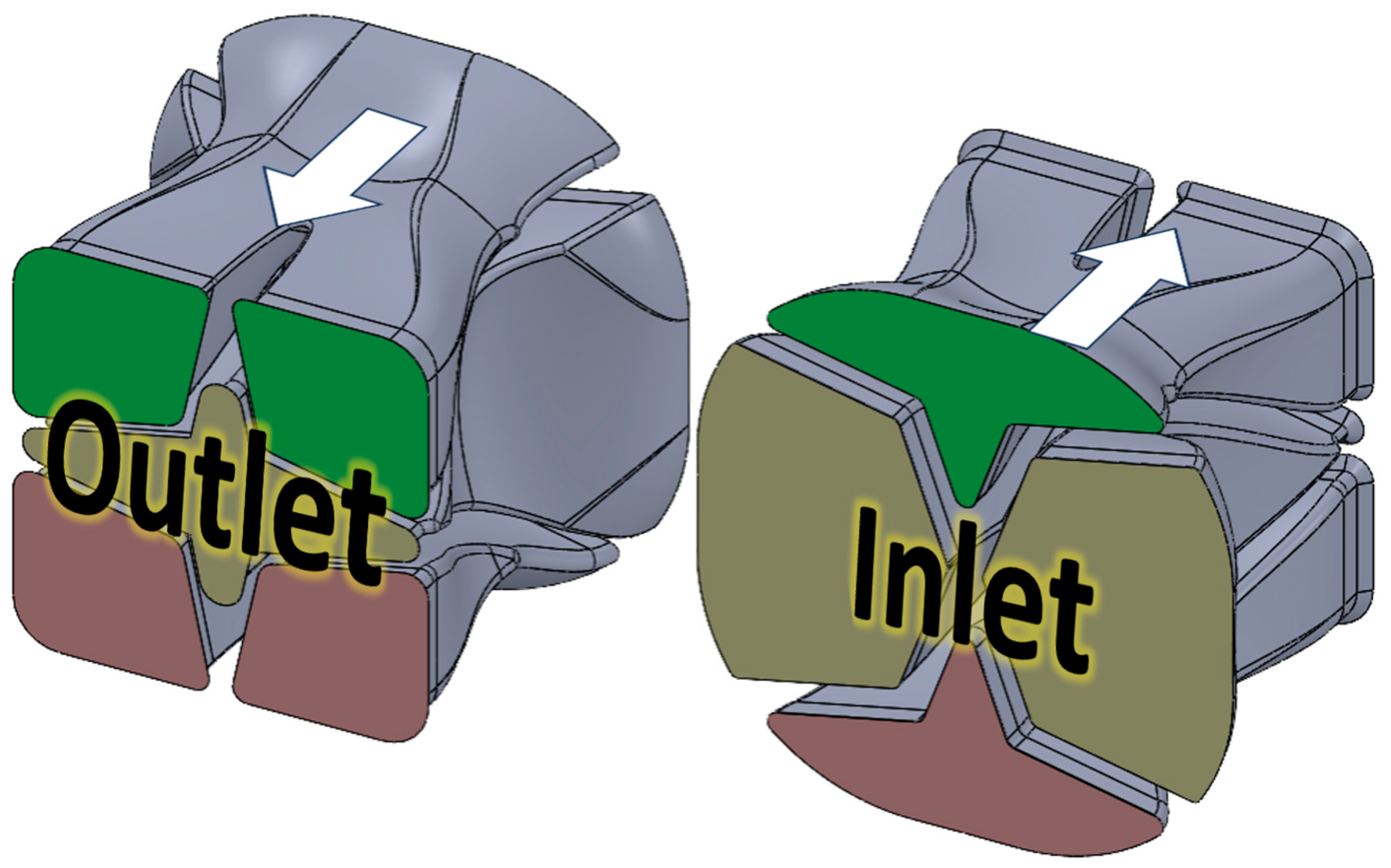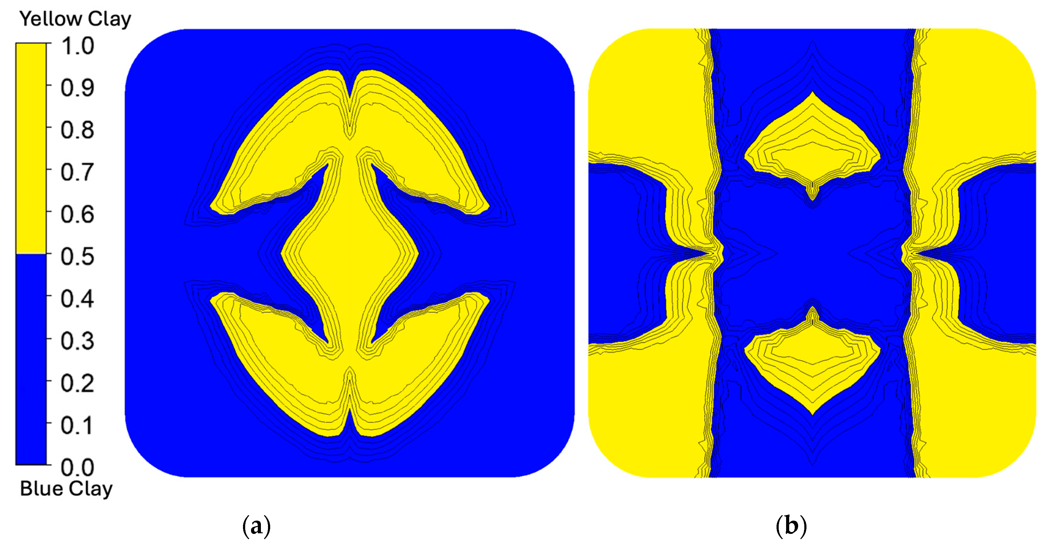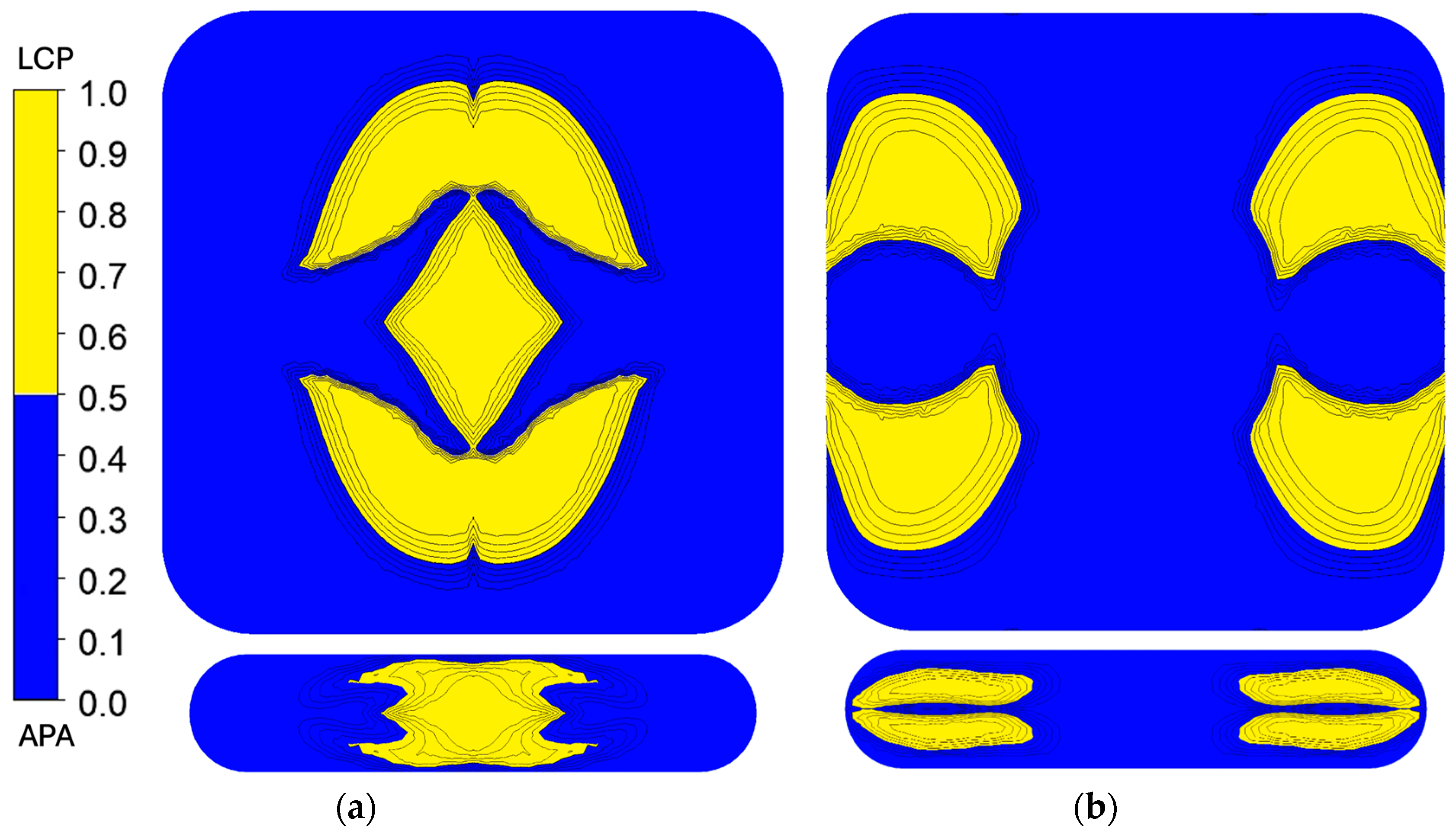 The rheological behavior of APA, LCP, and the polymer clay was essential for interpreting flow behavior and validating simulations with experimental results. The Cross–WLF model described the shear- and temperature-dependent viscosity of the APA/LCP system, while the BCY model captured the pseudoplastic behavior of the polymer clay. Simulations of polymer clay allowed the effect of geometry to be isolated from rheological contrast, providing a useful baseline for evaluating SFE performance. In particular, the Chevron configuration produced interface evolution that closely matched the polymer prototypes, while the I.O. configuration showed slightly more deviation, especially in the polymer system. These discrepancies were attributed to factors not captured by the idealized simulation, including die surface texture, wall slip, and the large viscosity mismatches between the LCP and APA phases.