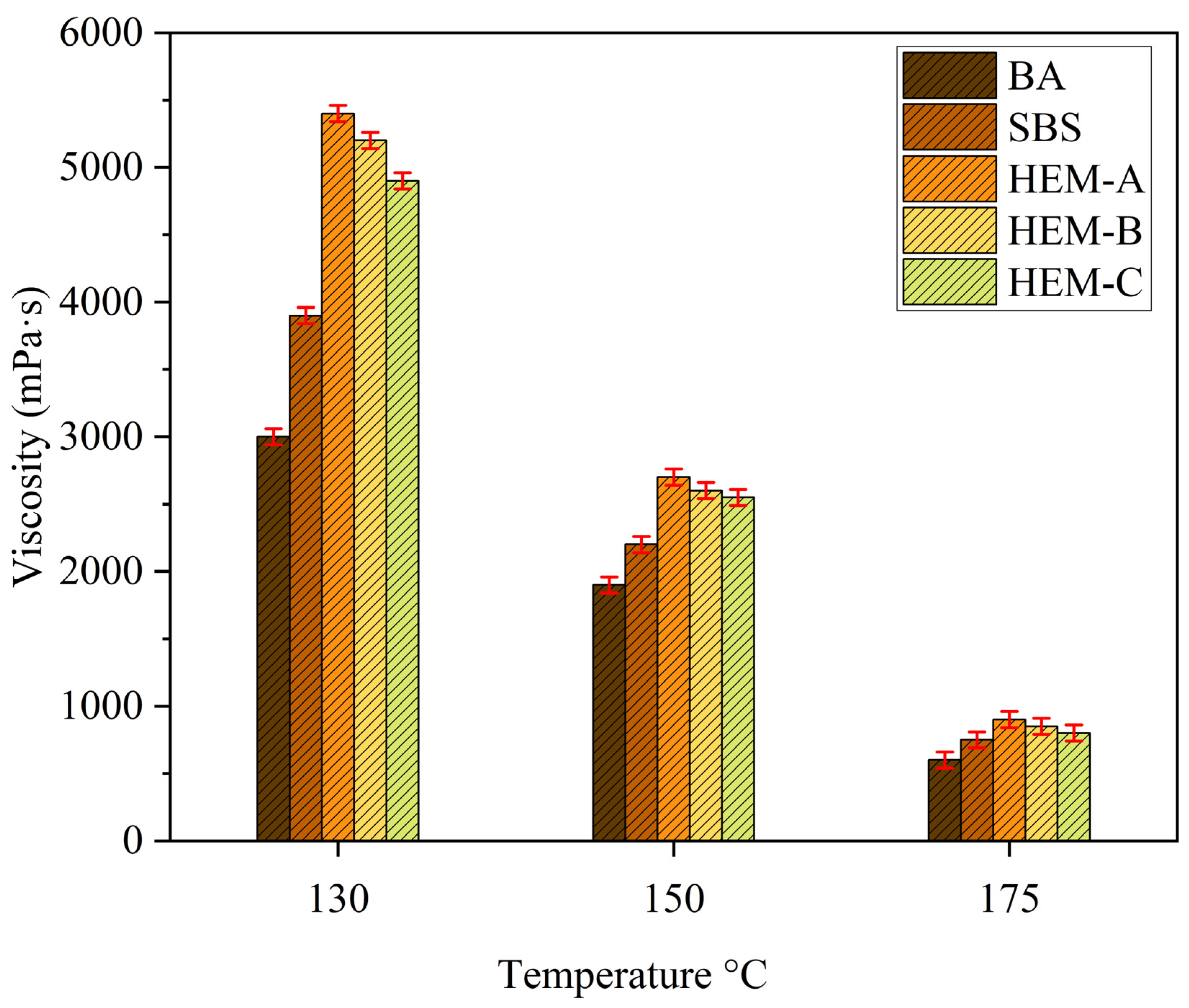 HEM-B exhibited significantly higher viscosity (2.10 Pa·s at 135 °C) compared to SBS (1.65 Pa·s), indicating greater resistance to flow at high temperatures but not necessarily higher stiffness.