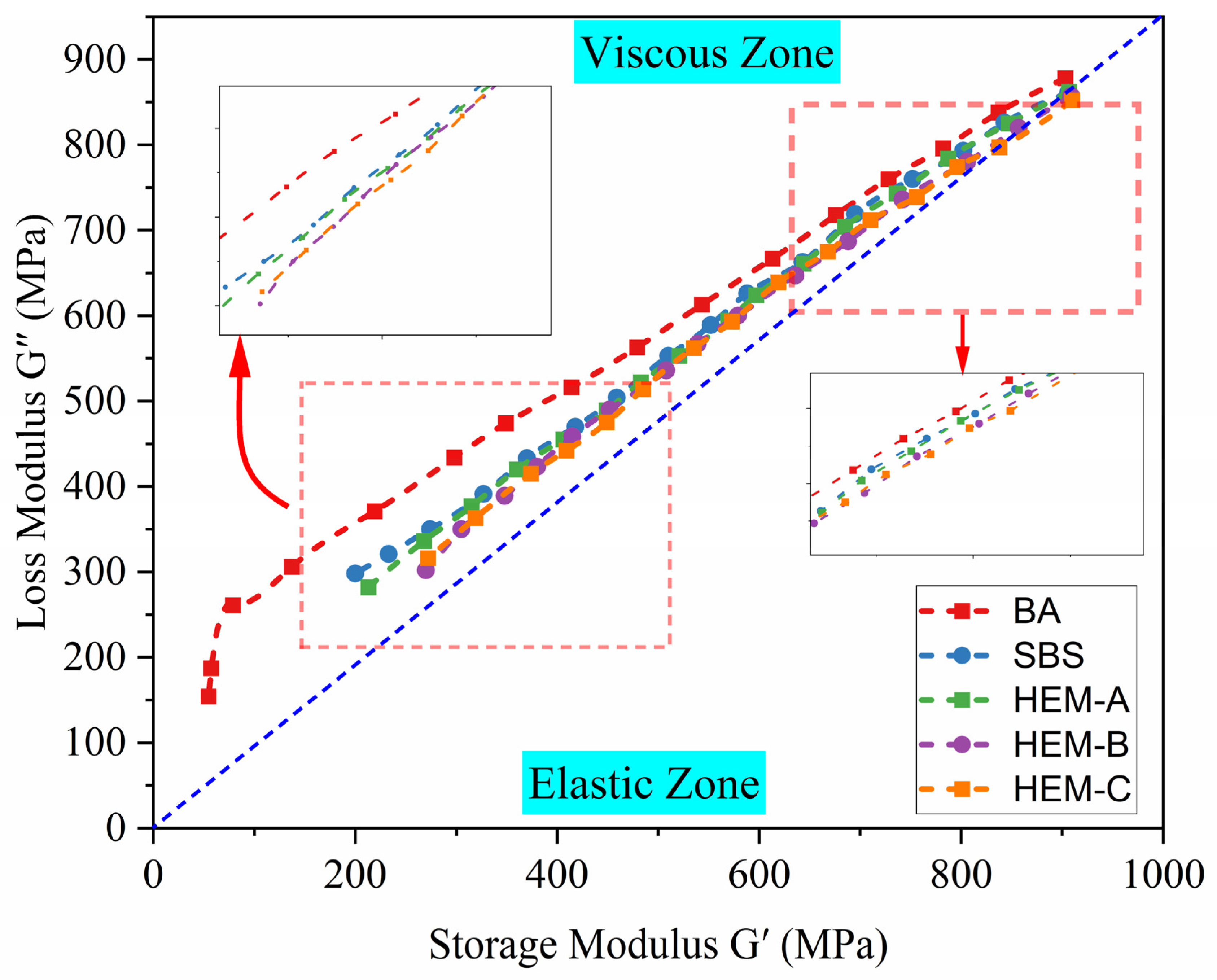 Furthermore, the scatter points for the HEM-modified asphalts are positioned closer to the viscous-elastic boundary compared to the base asphalt (BA), suggesting improved viscoelastic equilibrium and a more uniform phase structure. This indicates that HEMs contribute to superior energy dissipation and recovery, enhancing the binder’s performance under varying temperature and loading conditions.