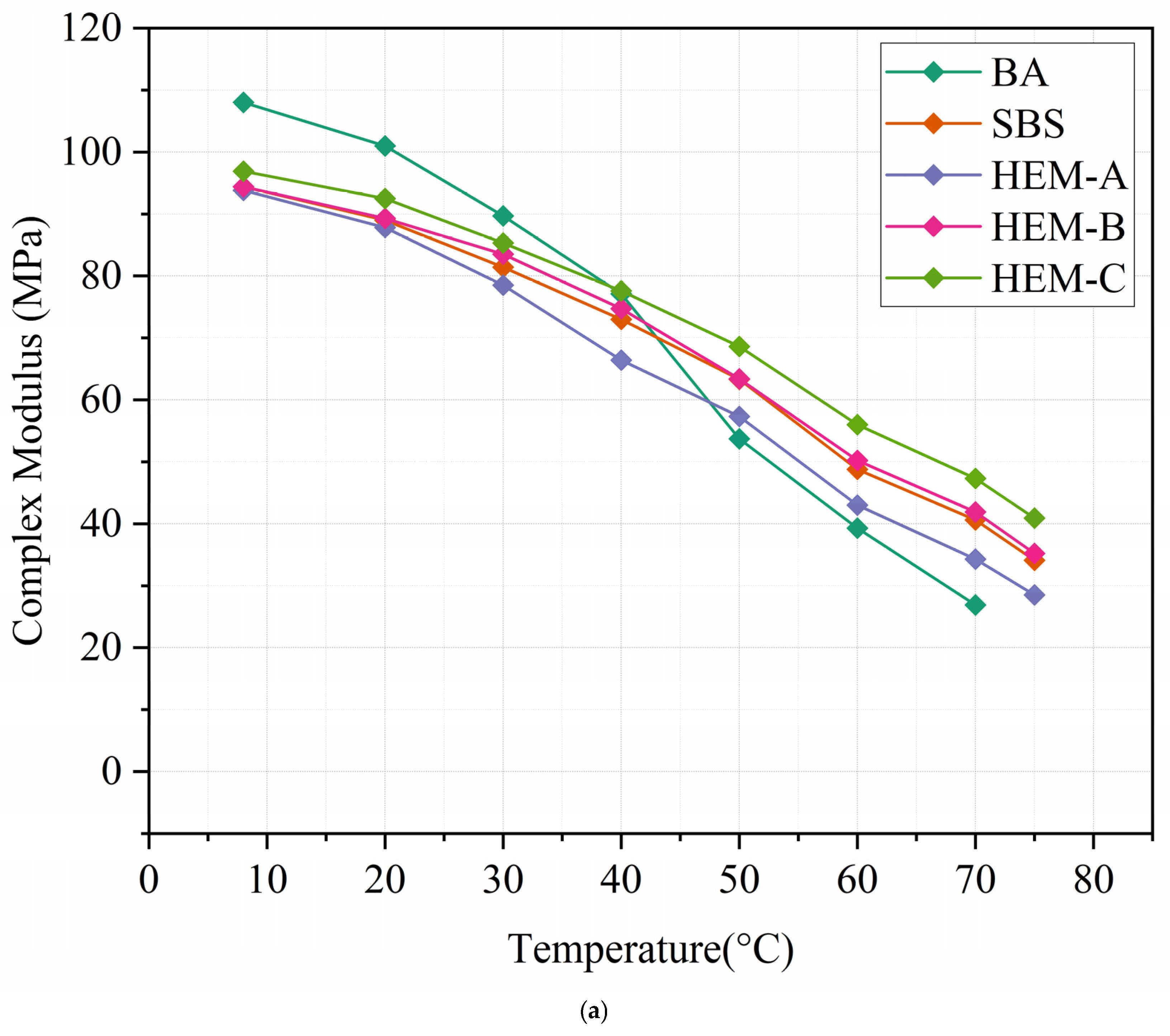 Figure 5a presents the isochronal complex modulus (G*) of asphalt binders as a function of temperature at a reference frequency of 1 Hz, derived from frequency sweep tests conducted over 0.1–10 Hz at 40, 50, 60, and 70 °C. All modified binders exhibit higher G* values than base asphalt (BA) across the 35–90 °C range, confirming enhanced high-temperature stiffness due to polymer–asphalt network formation. The consistent ranking HEM-B > HEM-C > HEM-A > SBS > BA reflects differences in modifier chemistry: the HEM-B dense thermoset network provides the greatest reinforcement, while HEM-A epoxy-tackified structure offers balanced elasticity [
