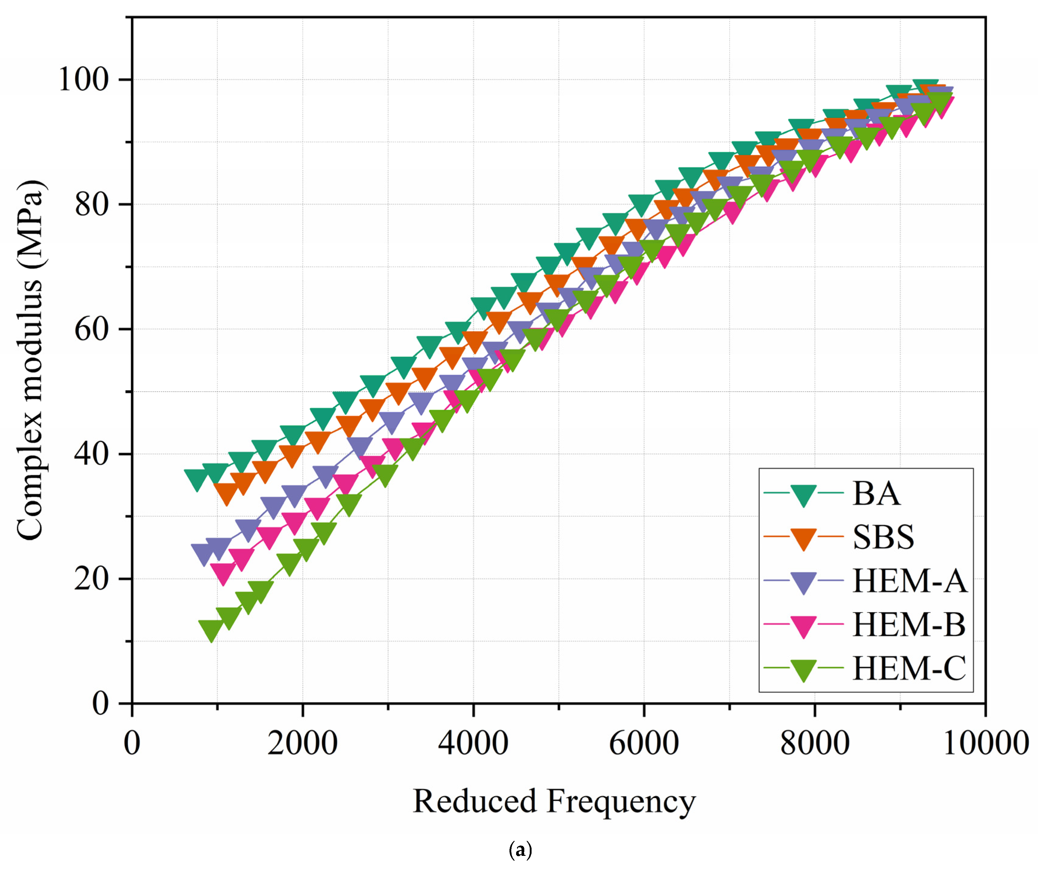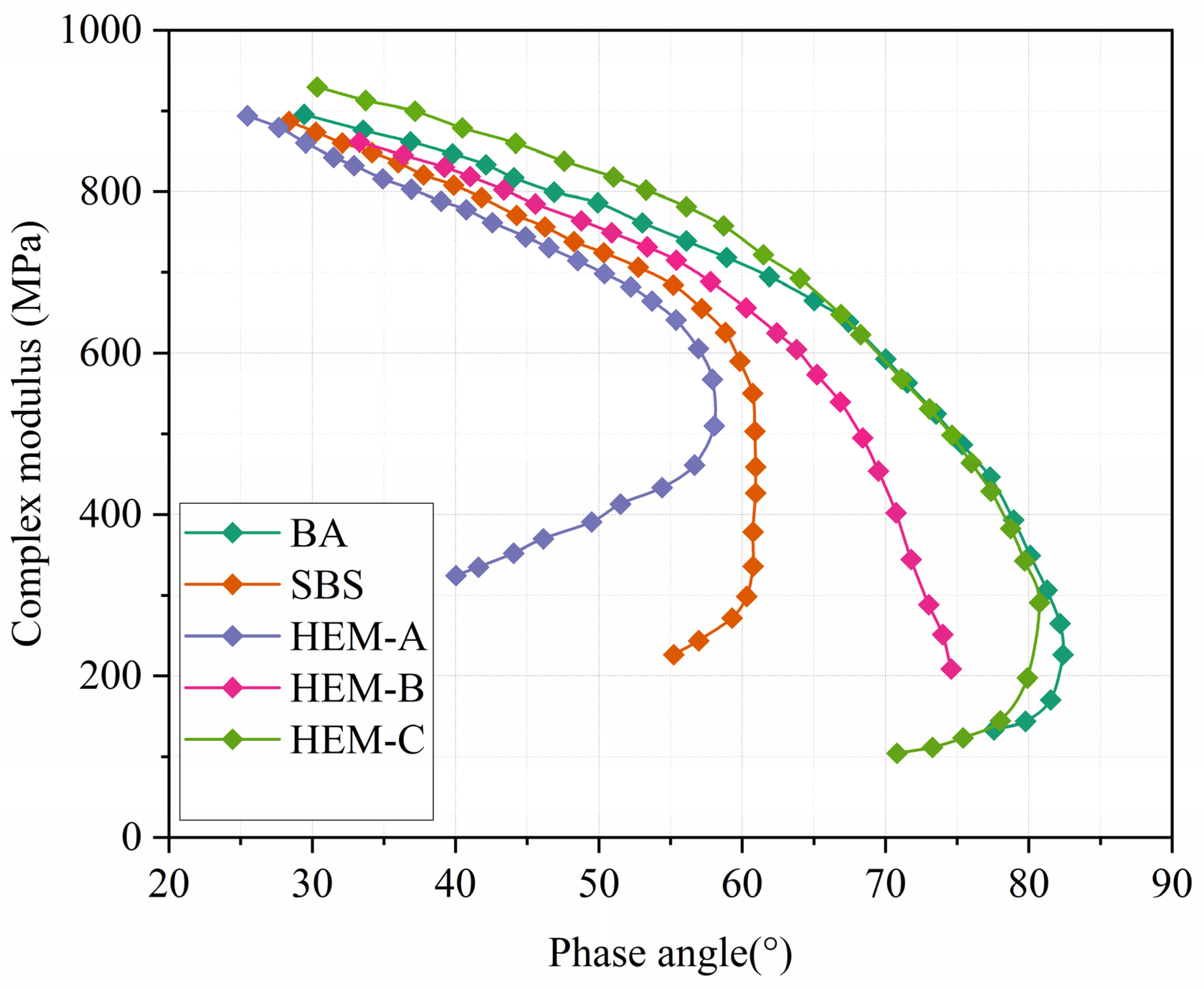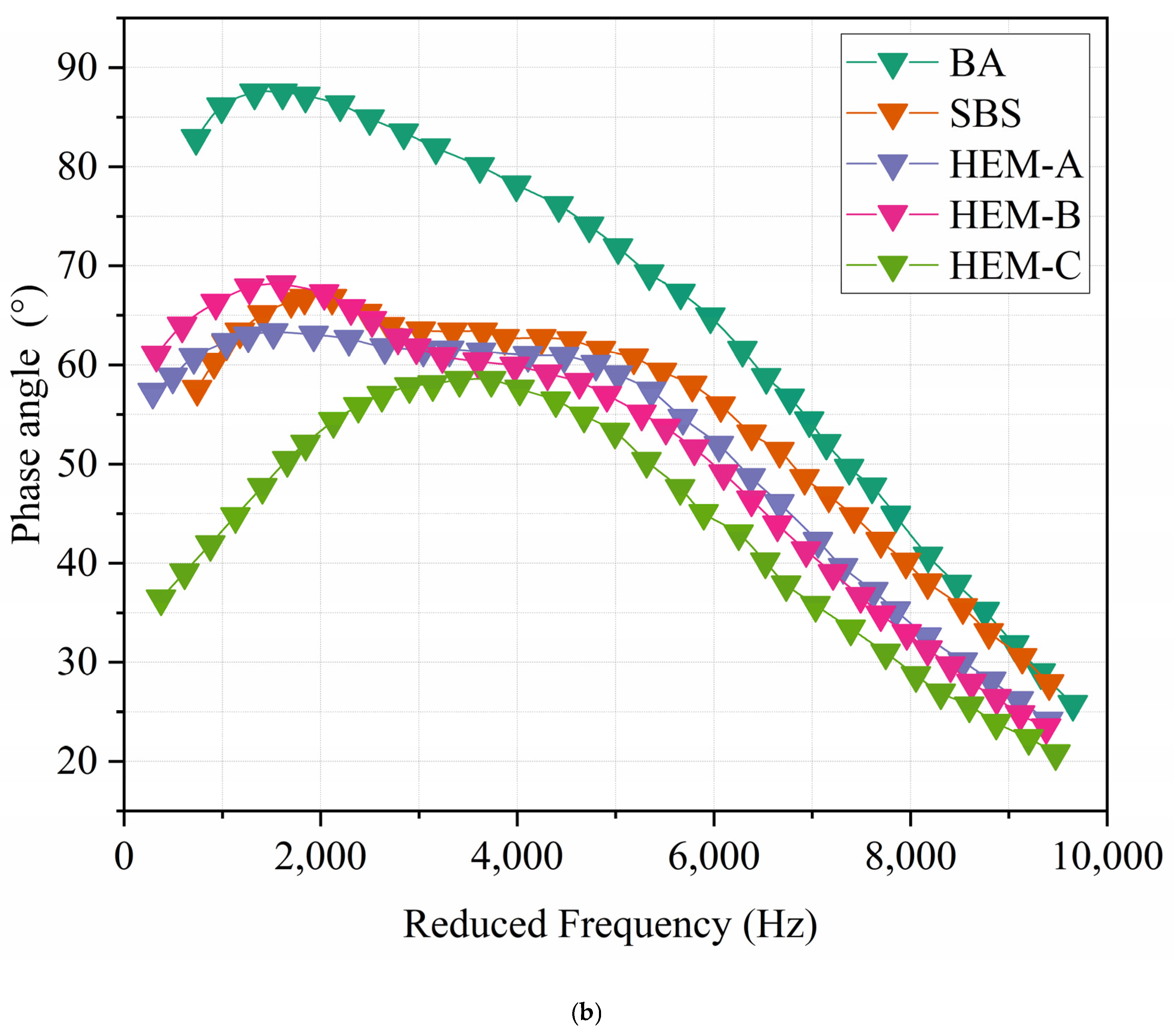 Figure 6, the plotted data for all asphalt binder samples exhibit continuous and smooth curves with minimal dispersion, indicating consistent rheological measurements. The curves corresponding to Base Asphalt (BA), SBS-modified asphalt, and HEM-B display a typical monotonic trend, characteristic of thermo-rheologically simple (TRS) behavior where the material’s viscoelastic properties can be reliably described using time-temperature superposition principles.