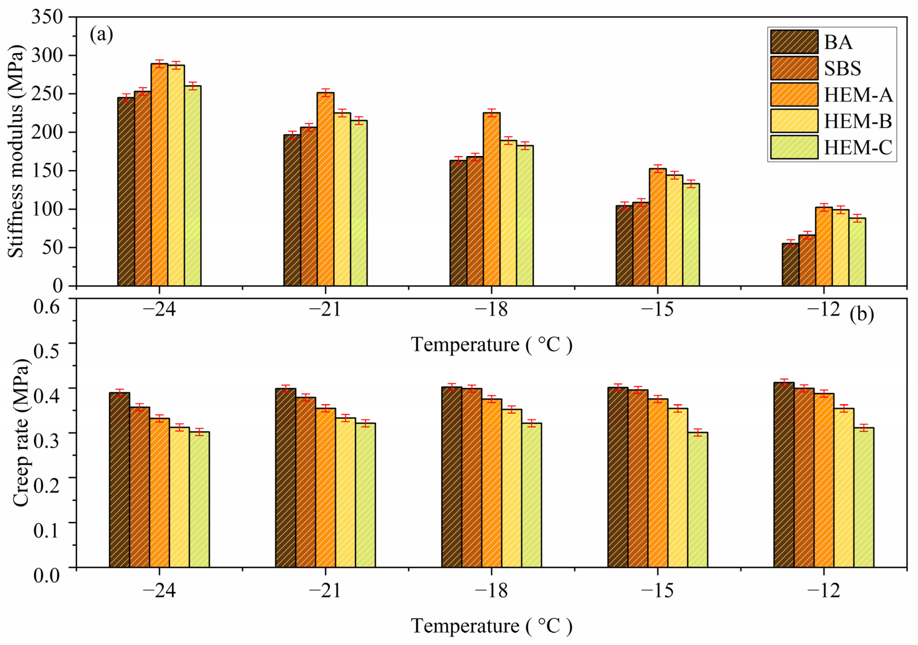 Moreover, at −21 °C and −24 °C, HEM-A-modified asphalt exhibited lower stiffness modulus values than the base asphalt, indicating improved flexibility and enhanced creep compliance properties favorable for mitigating thermal cracking. Conversely, HEM-C-modified asphalt showed slightly higher stiffness values than the base asphalt across the same temperature range, suggesting marginally reduced low-temperature flexibility.