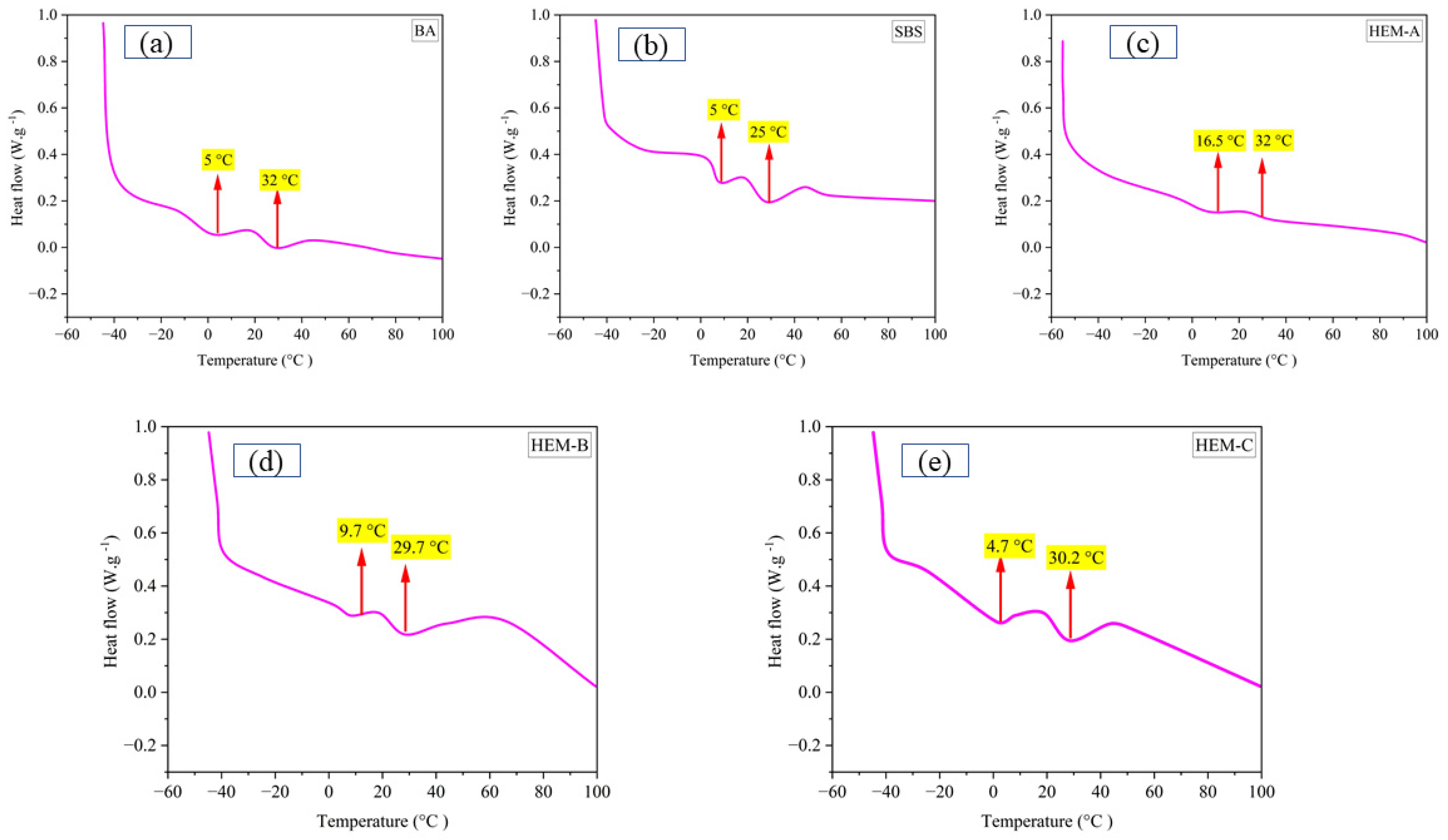 Differential Scanning Calorimetry (DSC) was conducted to evaluate the thermal behavior of base asphalt (BA) and modified binders incorporating SBS and three types of high-elasticity modifiers, As shown in