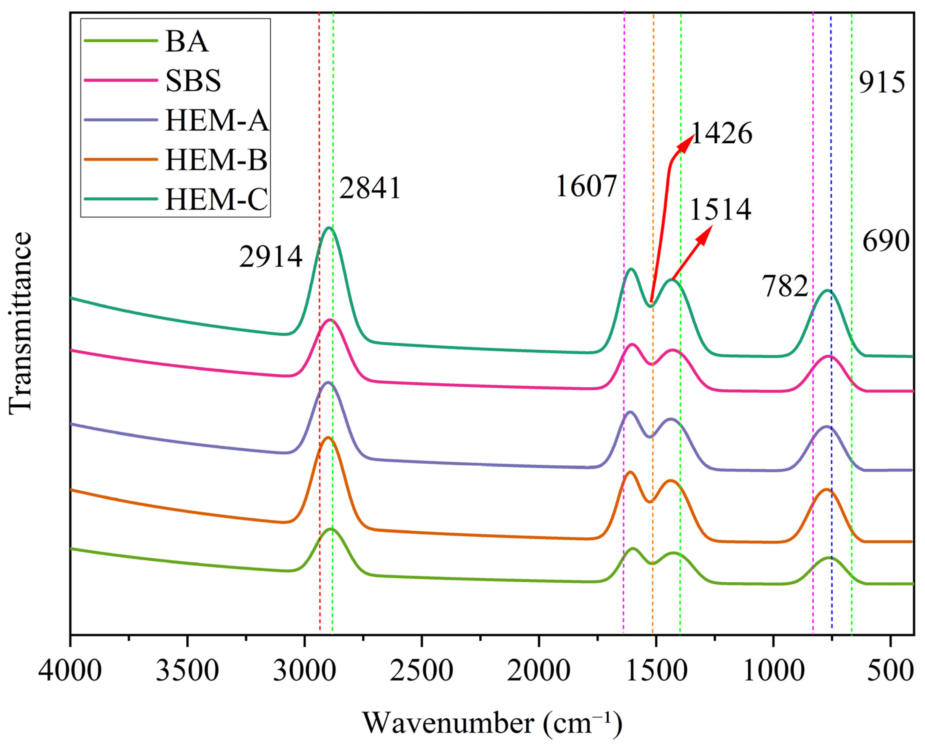 The distribution of distinctive peaks in BA, SBS, and HEMs is consistent mainly; however, the intensity of these peaks varies among the different asphalt binders, as shown in