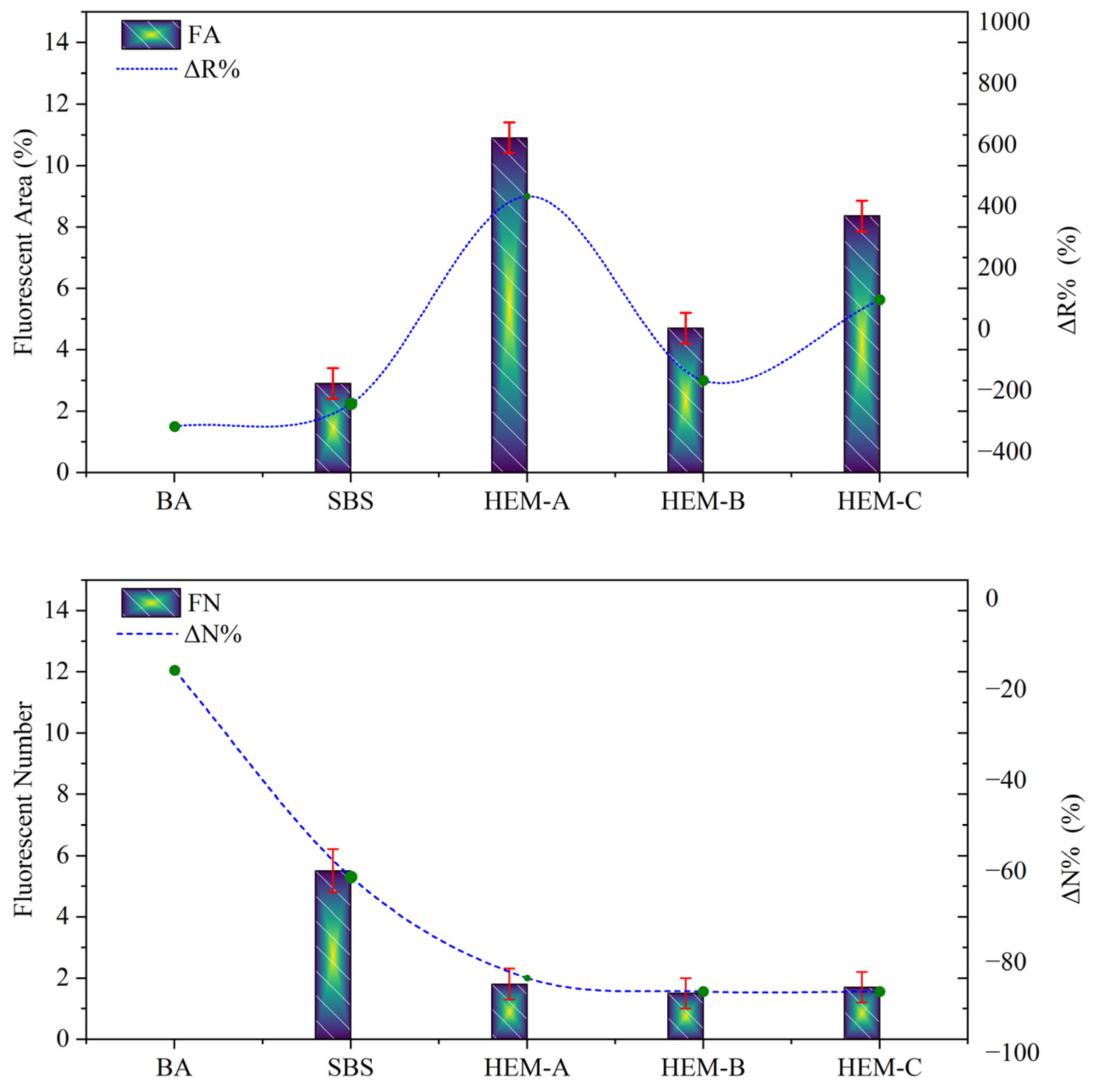 As expected, BA, lacking polymeric modifiers, exhibited minimal FA (1.2%) and maximal FN (13.0 particles/mm2), with small particle size (5.2 ± 1.1 µm), indicative of insufficient phase development. Among modified binders, HEM-A demonstrated the highest FA (10.0%) and lowest FN (5.2 particles/mm2), with uniform particle size (25.0 ± 3.2 µm) signifying homogeneous dispersion and continuous elastic network formation. This microstructural uniformity reflects superior physicochemical compatibility, directly correlating with its optimal rheological balance (G*/sinδ = 4.53 kPa, m-value = 0.295).