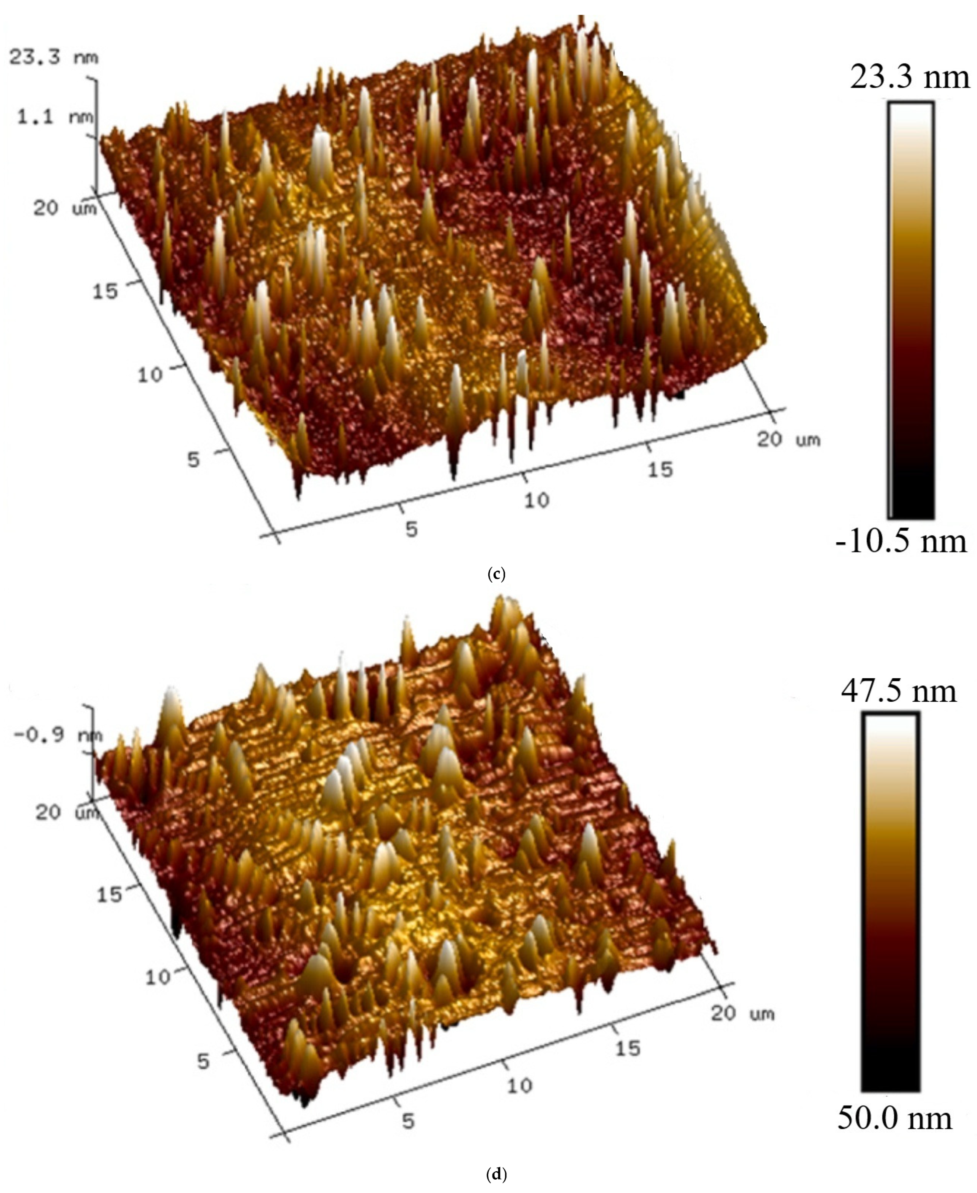 AFM (atomic force microscopy) was used to develop representative two-dimensional and three-dimensional morphologies of asphalt samples, as shown in