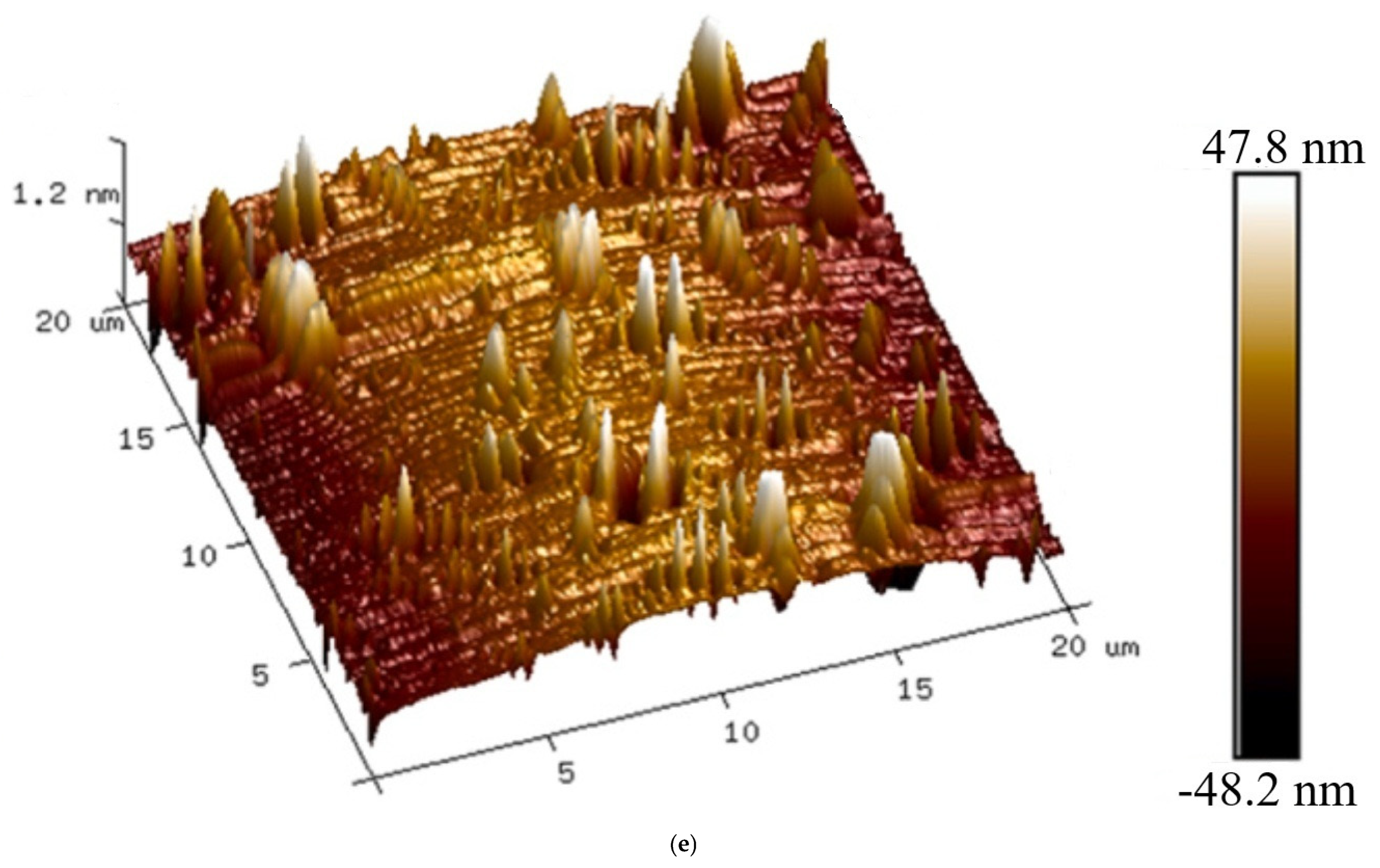 Figure 14. The purpose of this analysis is to determine the influence that modifiers have on the microscopic structural patterns of asphalt. An evaluation of the nanoscale surface characteristics of asphalt samples was conducted using microscopic morphological analysis. This evaluation included the quantity and size of “bee structures,” the maximum depths of each of the most prominent and least prominent features, as well as the surface irregularity. The microscopic characteristics of macromolecular microcrystalline wax, highly polar asphaltenes, oils, and other colloidal components significantly influence the macroscopic properties of asphalt. These microscopic components interact to determine the material’s structural stability, elasticity, and viscoelastic behavior, ultimately affecting its performance under varying environmental and loading conditions.