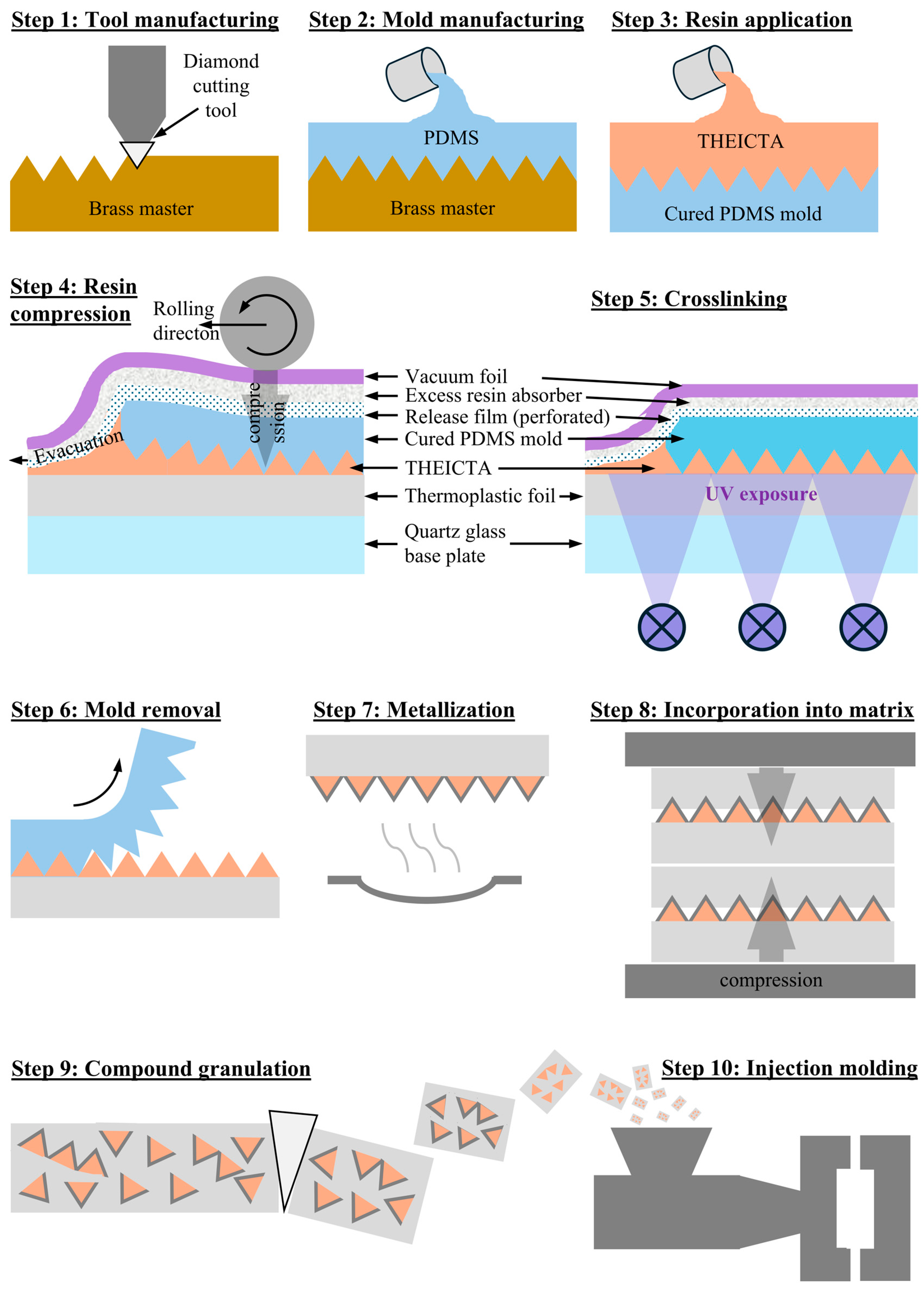Demski, N.M.; Seidlitz, H.; Kuke, F.; Dorn, O.N.; Zoglauer, J.; Hückstaedt, T.; Kamm, P.H.; García-Moreno, F.; Kremp, N.; Dreyer, C.; et al. Flow-Line-Reducing Tetrahedral Metal Effect Pigments for Injection Molding: A Yield-Rate-Improved Particle Manufacturing Method Based on Soft UVImprint Lithography. Polymers 2025, 17, 2708. https://doi.org/10.3390/polym17192708