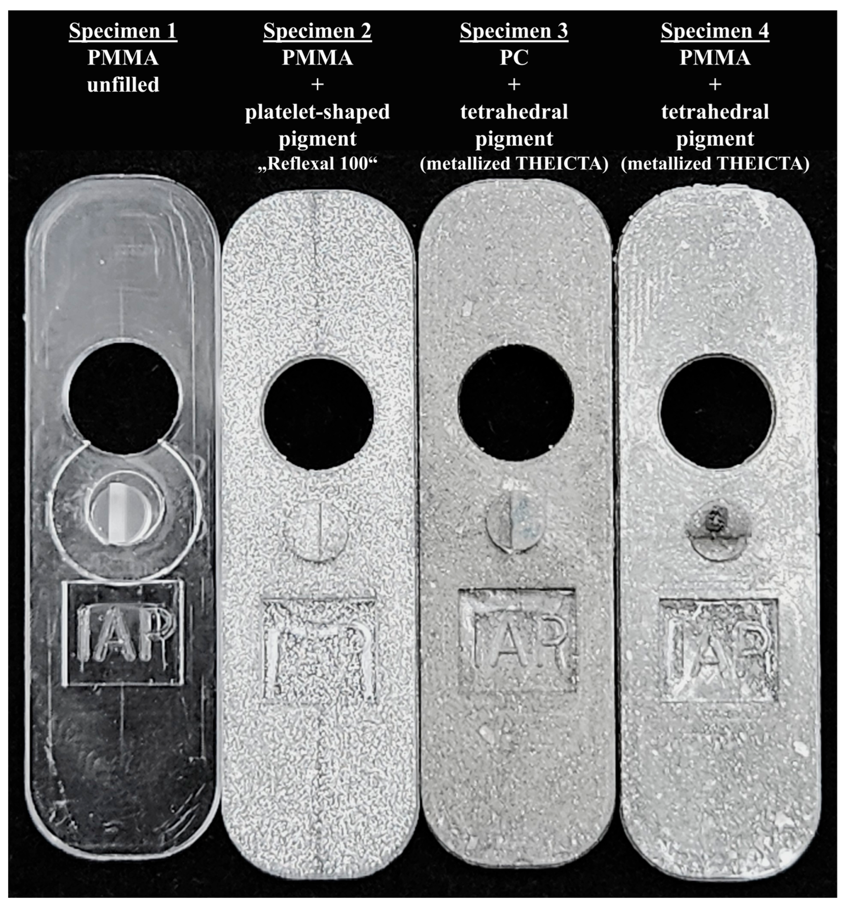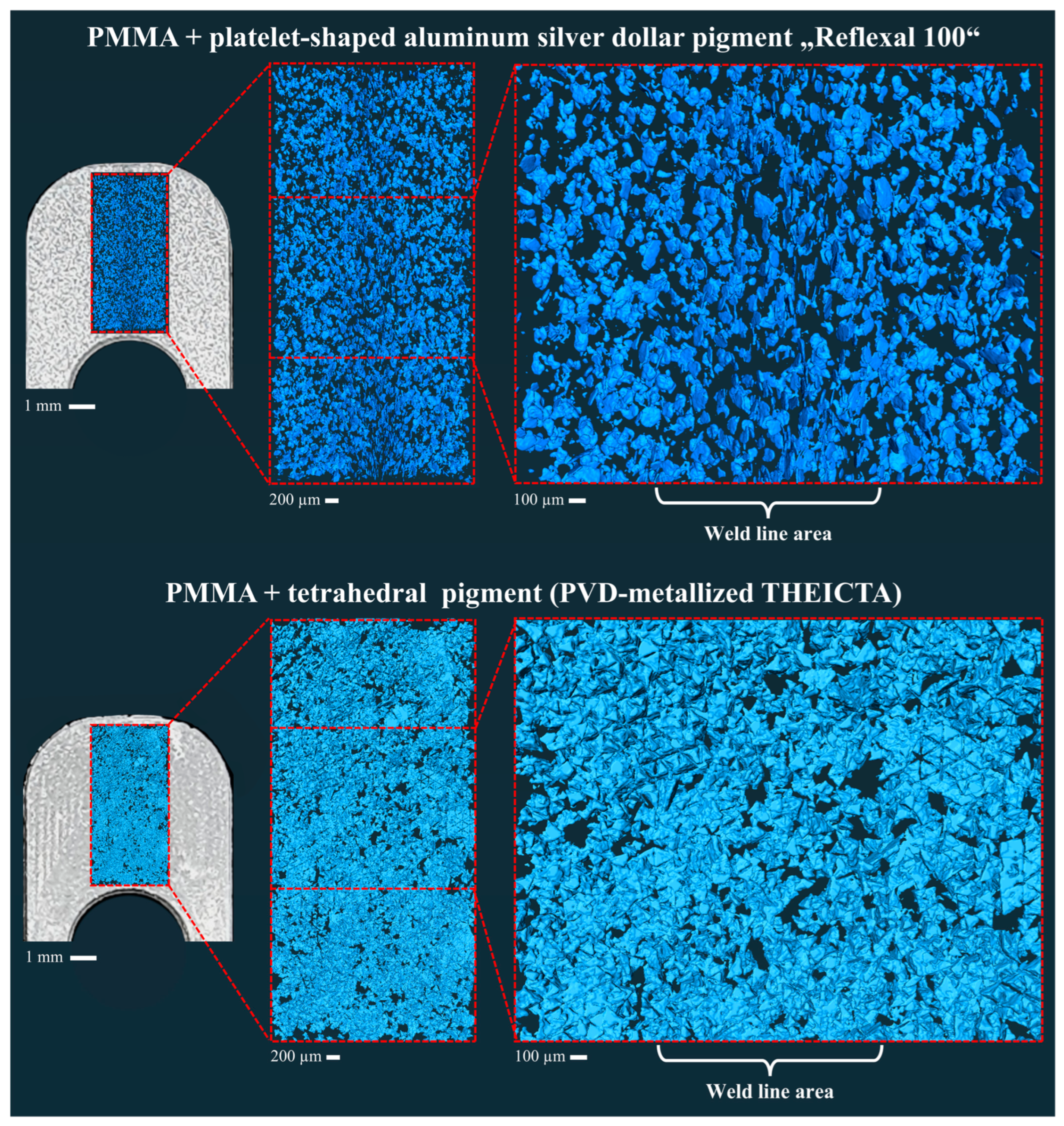 - Demski, N.M.; Jagodzinski, M.; Malcher, M.; Rolón, D.A.; Kamm, P.H.; Neu, T.R.; Garcia-Moreno, F.; Oberschmidt, D. Metal effect pigments for reducing flow-line visibility. In Proceedings of the Euspen’s 20th International Conference & Exhibition, Geneva, Switzerland, 8–12 June 2020. [Google Scholar]