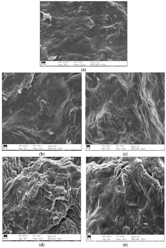 A set (a–e) of SEM images in different ratios of CMC:CC (100:0, 90:10, 80:20, 70:30, 60:40), respectively. (500× magnification).