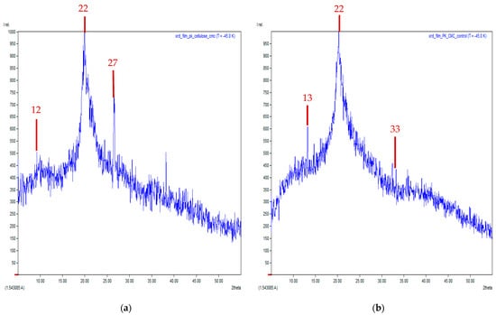 Meanwhile, characteristic peaks of commercial-grade CMC were observed at 2θ, 12°, 22°, and 27° and compared to CMC converted from WH that was found at 2θ, 13°, 22°, and 33° (See Figure 7a,b). For peak positions of commercial-grade CMC, an expected peak typically centered at around 21–22°. This is in agreement with the results obtained only at 22° and while other peaks found were at 12° and 27°, it might not be characteristic and unusual for pure CMC. For the case of CMC extracted from WH, the peaks showed were similar to commercial-grade CMC and the main peak was observed at 22°. However, the peak at 13° was an unusual peak (not typical for cellulose or CMC) and the peak at 33° was close to cellulose but slightly shifted. It might be summarized that incomplete conversion of cellulose to CMC was observed and still retained a significant crystalline cellulose structure.
