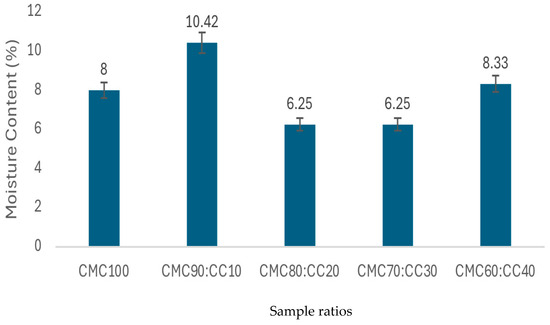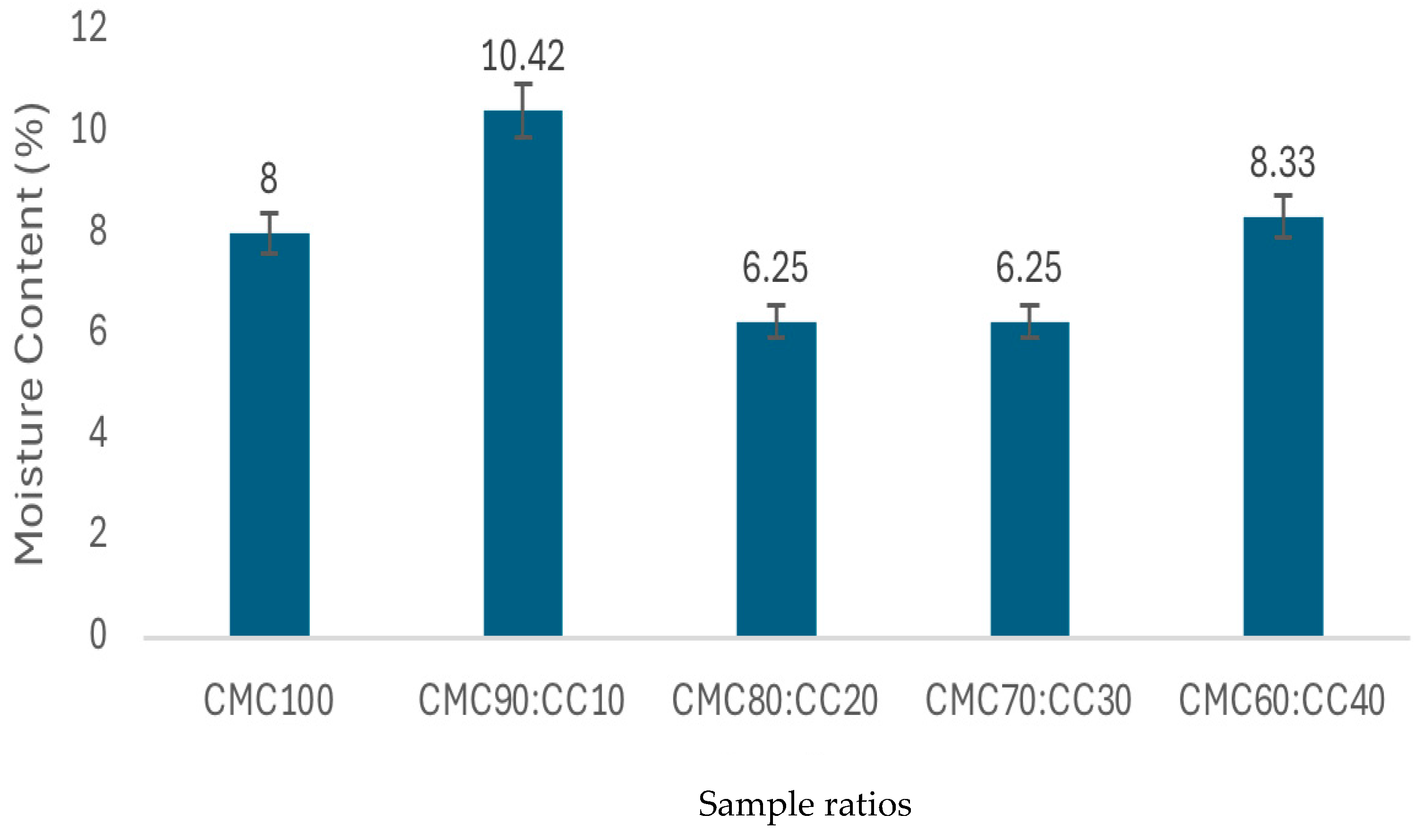 Moisture content of the BCS under variations in CMC:CC ratios (100:0, 90:10, 80:20, 70:30 and 60:40) (in duplication for reproducibility).