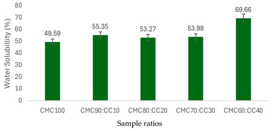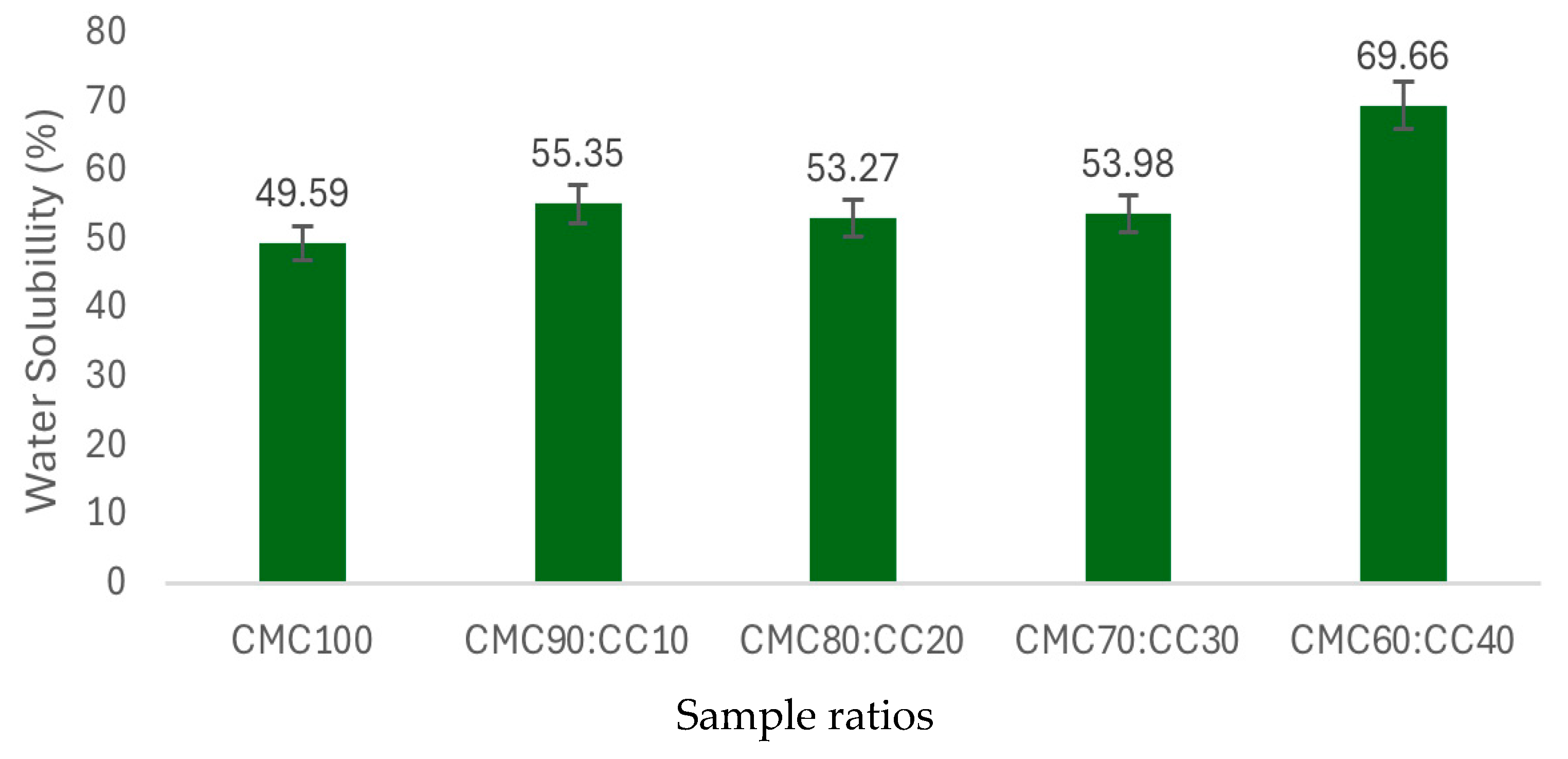Moisture content (Figure 8) and water solubility (Figure 9) can be seen as important parameters for the BCS performance. Elevated moisture levels significantly compromise mechanical property by reducing tensile strength and stability. Meanwhile, water solubility directly limits application scope, particularly in humid environments. Analysis of moisture content and water solubility of the BCS in different ratios of CMC:CC are shown in Figure 8 and Figure 9. It was found that ratios of 80:20 and 70:30 reached the lowest moisture content while the highest moisture content was found at the ratio of 90:10. Ratios of CMC:CC at 100:0 and 60:40 reached similar levels of water solubility due to the maximum CMC and starch contained in CC, respectively. The results obtained were in agreement with previous studies mentioning that the hydrophilic nature of both CMC and CC resulted in high moisture absorption, leading to instability and reduced mechanical properties. This becomes a limitation that restricts outdoor applications and requires careful packaging and storage conditions [,,,]. Thus, the ratio of 80:20 was chosen due to a better moisture barrier property and stronger intermolecular interaction between CMC and CC.