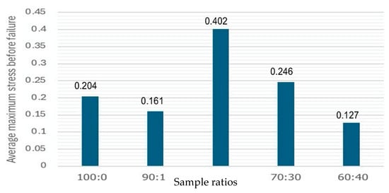 Average maximum stress as a function of ratios of CMC:CC in the BCS under variations in CMC:CC ratios (100:0, 90:10, 80:20, 70:30 and 60:40).