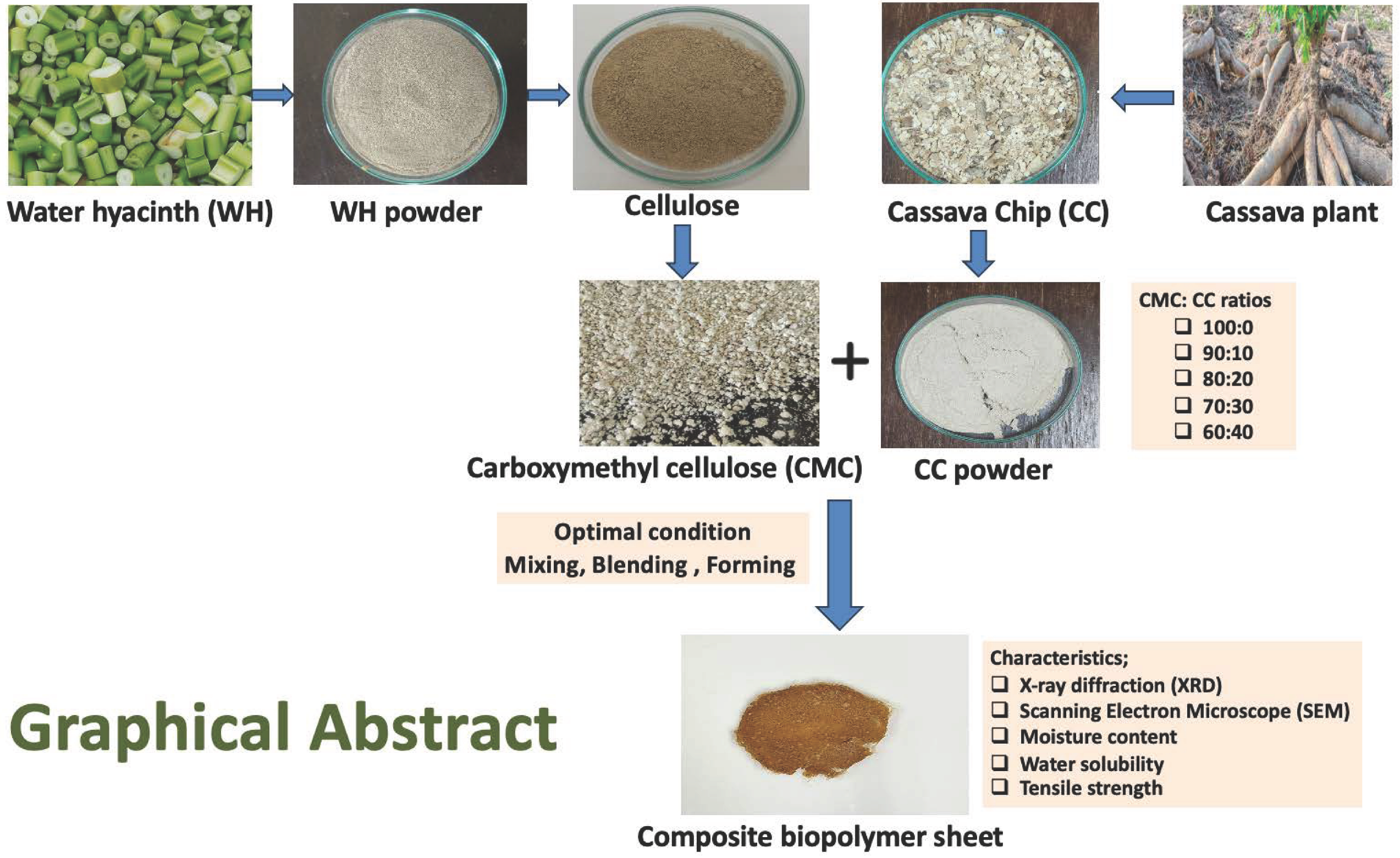 The persistence of the synthetic plastic waste problem makes it one of the most pressing environmental challenges. Sustainable material is an alternative approach to reduce petroleum plastics. In this research, our work aims to convert two biomaterials, water hyacinth (WH) and cassava chip (CC), into value-added biopolymer composite sheets (BCS). The raw materials of both WH and CC were prepared and characterized using physical and chemical treatments. Alkali treatments and chemical modifications were applied to remove lignin, protein, lipid, and other inhibiting components. After that, the two main raw materials of the WH and CC components were varied (100:0, 90:10, 80:20, 70:30, and 60:40, respectively) to investigate the optimal conditions for mixing, blending, and forming processes. Finally, mechanical properties (tensile strength), physical properties (surface morphology using a scanning electron microscope (SEM), crystalline structure by X-ray diffraction (XRD), and water solubility were also evaluated. The results obtained obviously revealed that the BCS reached an optimal ratio of 80:20 and exhibited outstanding properties. We were successful in exploring the potential use of a combination of two kinds of biopolymers under optimal conditions to produce an effective and environmentally friendly BCS in a manner that promotes a sustainable bio-circular economy and zero-waste concepts.