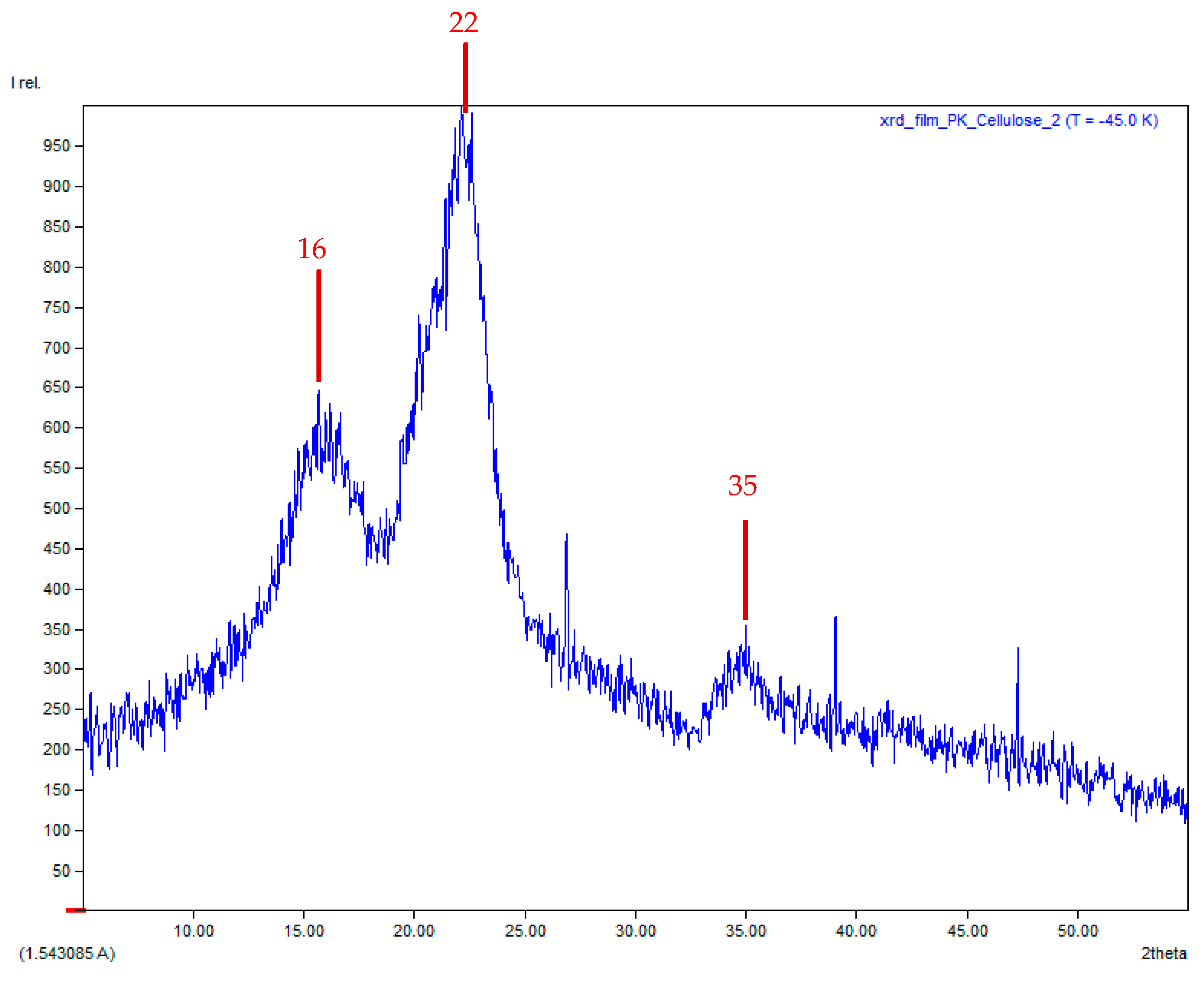 XRD is a crucial analysis for characterizing the BCS. XRD patterns indicate changes in crystallinity, identifying amorphous region formation and polymer chain rearrangement during blending and forming. Figure 6 shows the XRD technique, a well-established method for cellulose characterization. It was found that cellulose had a semi-crystalline structure and characteristic peaks showed around 16°, 22° and 35°. The XRD pattern obtained appeared corrected for the cellulose extracted from WH. Peak intensity pattern at 16° and 22° were of medium intensity and the strongest peak, respectively, and corresponded to native cellulose I that was the most abundant, occurring in a specific crystal structure, and usually found in the cell walls of plants []. Although the peak showed at 35° was weaker, but distinct, it was corrected and also classified as cellulose I.