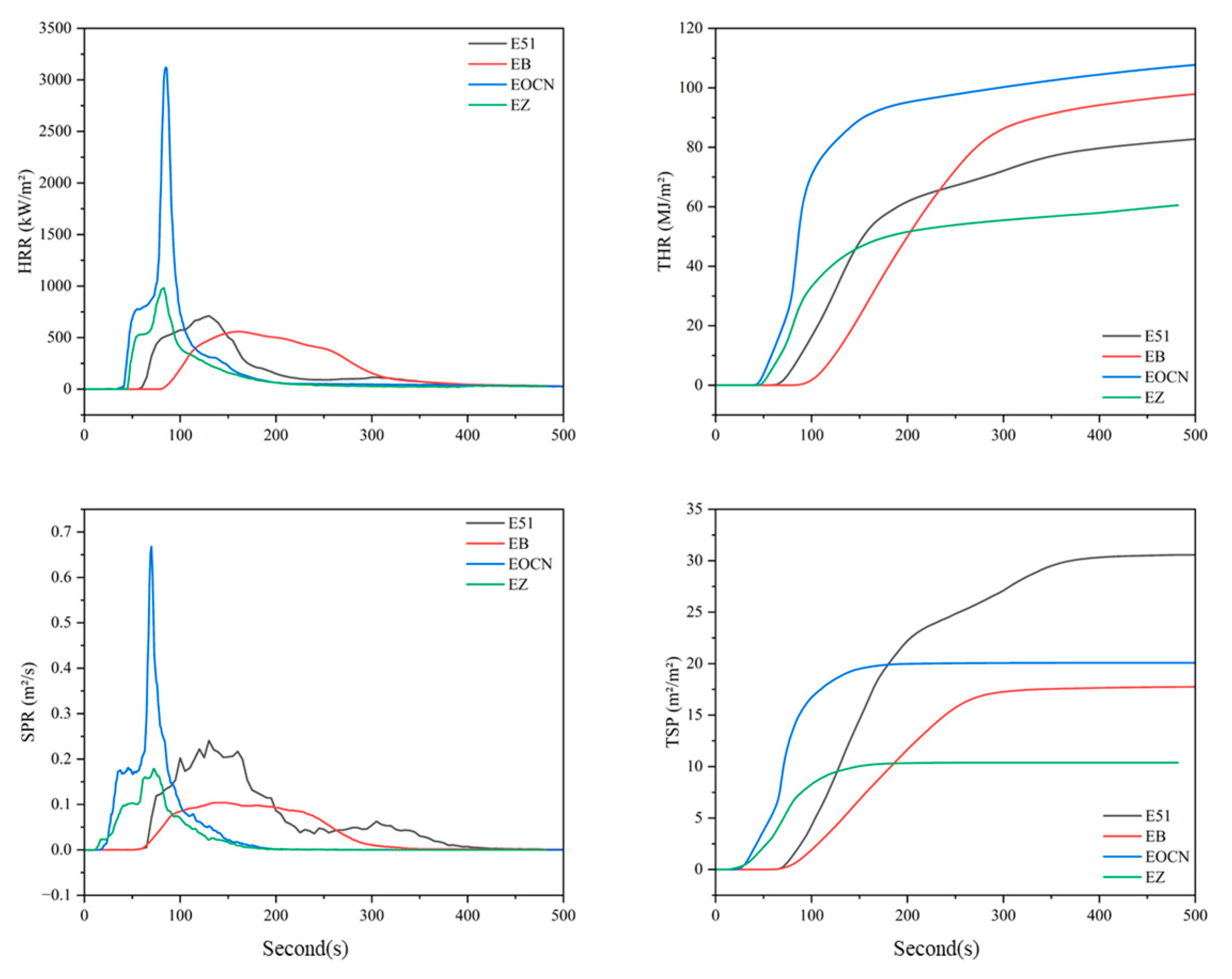- PPPS was chemically grafted into the molecular structures of E51 and EOCN resins, significantly improving their thermal stability and char residue yield. During combustion, silicon is uniformly distributed within the char residue as silicon oxides, forming a dense and homogeneous char layer that suppresses resin combustion, smoke transport, and reduces heat release and smoke generation. Compared to unmodified resins, the TSP of EB and EZ decreased by 54.8% and 48.3%, respectively. Compared with additive modification, the main reason for the significant smoke suppression effect is that the distribution of silicon elements introduced by grafting is more uniform, resulting in a more uniform distribution of silicon oxides after the resin pyrolysis.