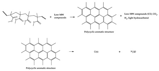 42]. Although not fully known, it is estimated that char is formed due to inter- and intramolecular rearrangement reactions, forming a polycyclic aromatic structure, as shown in