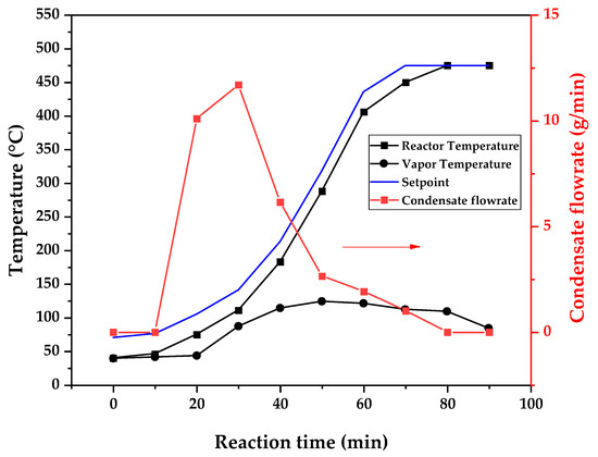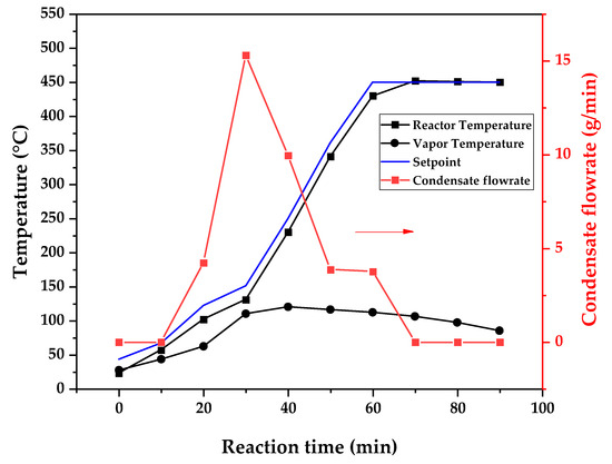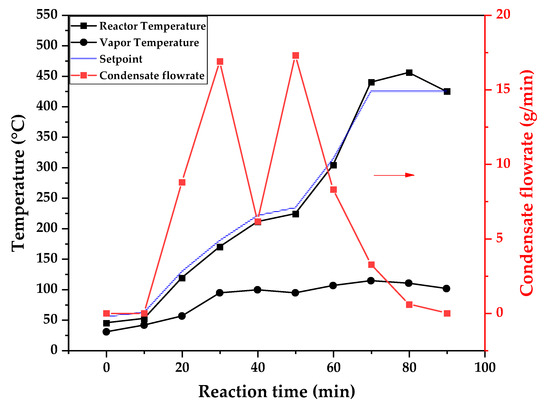 Figure 9 (425 °C), the maximum vapor temperature was 114 °C (70 min of reaction), but most of the liquid was formed below 100 °C. For