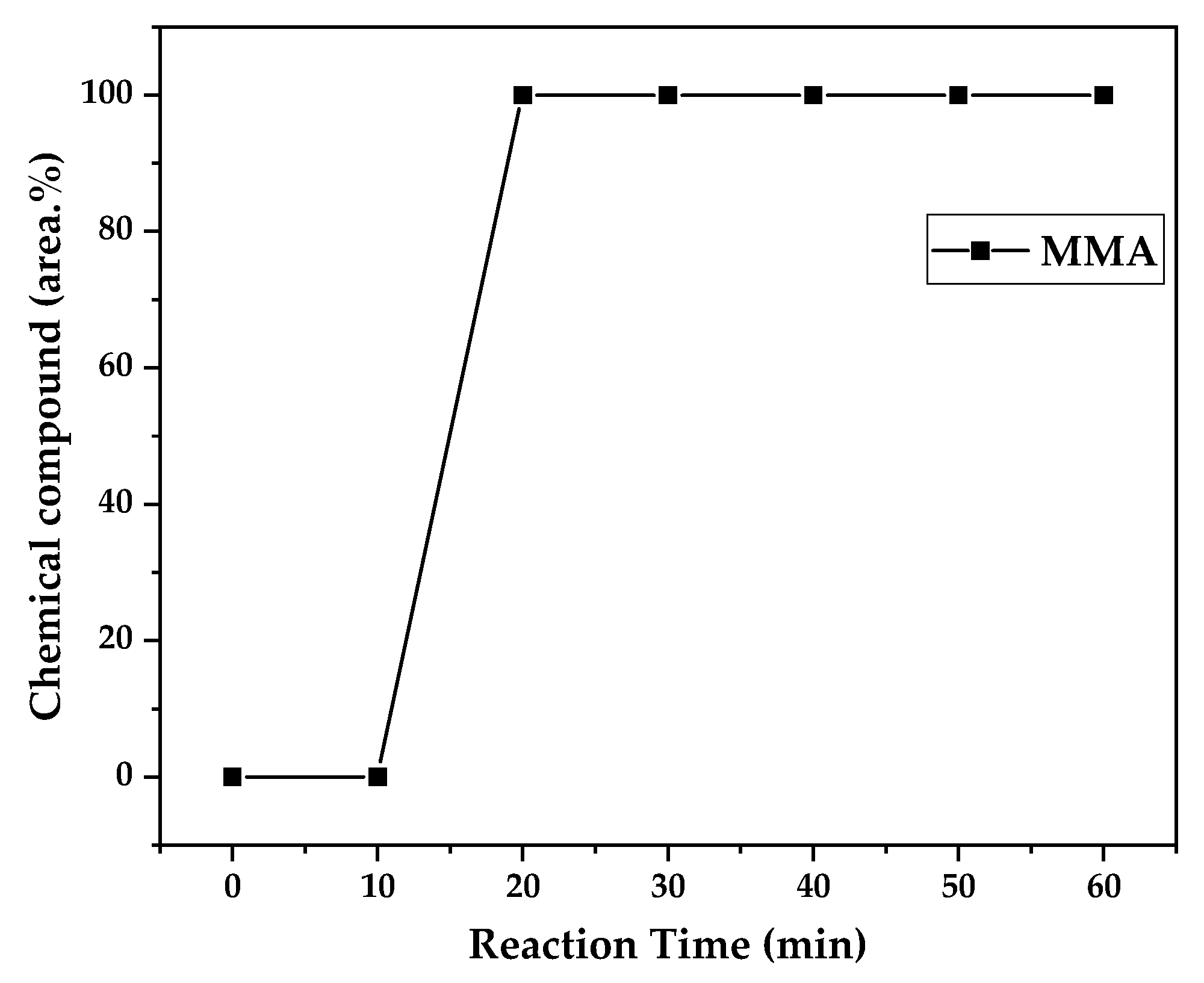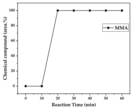 Figure 11, higher heating rates produced lower liquid condensate yields, but the chemical composition of the obtained liquid fraction shows that for most of the time, it was majorly composed of MMA, indicating that initially, most of the secondary products formed were gases, being in the non-condensable gases phase, and were formed due to secondary cracking reactions of the diffusing MMA through the heated polymeric bed. For the experiment conducted at 425 °C, the liquid product was composed of 100 area.% of MMA, and no side products were formed in the liquid phase with a char yield of 9.44 wt.%. For the experiments using higher heating rates and final temperatures in