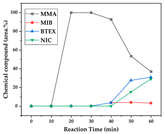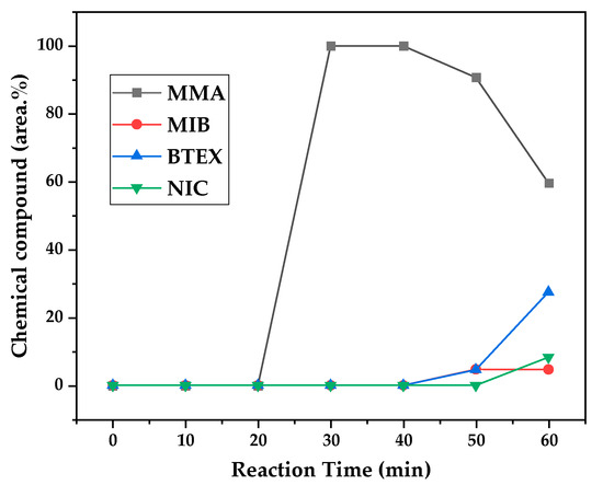 Figure 14 for the reactions conducted at 450 and 475 °C, respectively. After 20 min of liquid condensation, the composition starts to change from 100 area.% of MMA to side products as methyl isobutyrate (MIB); aromatic hydrocarbons such as benzene, toluene, and xylene (BTEX); and other complex compounds that could not be accurately identified, supposedly hydrocarbons and oxygenated compounds with long chains of carbons (char and tar precursors) [