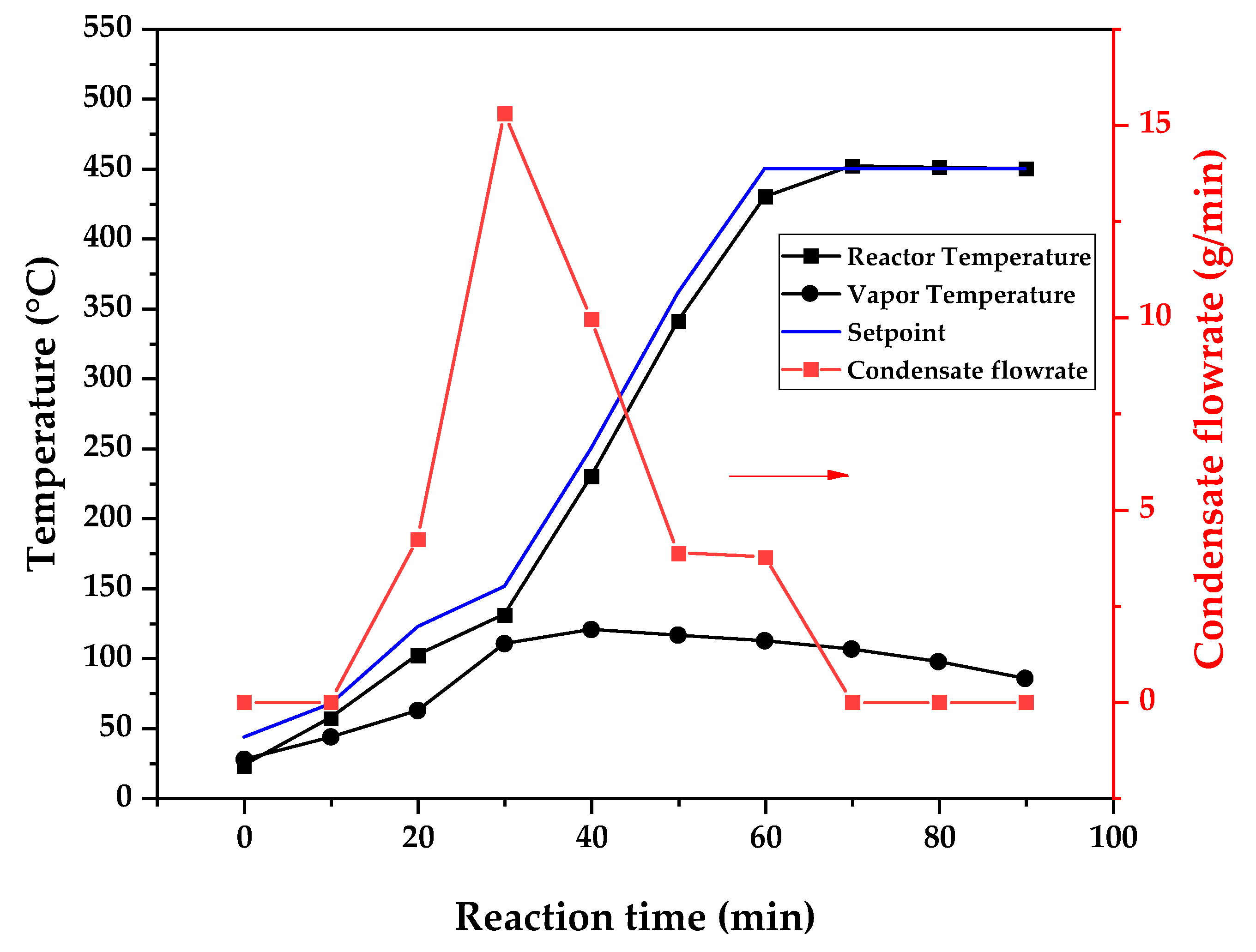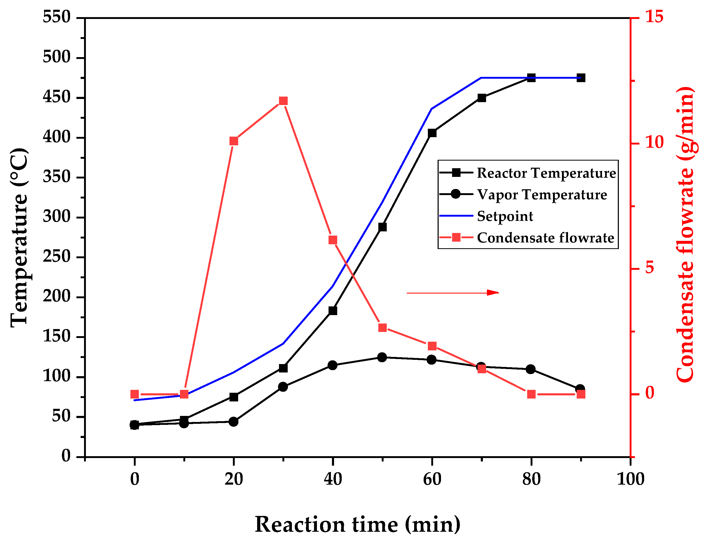 Figure 11. The condensate flowrate was calculated by collecting the liquid condensate at each timestamp (every 10 min) and weighting it. The flowrate was then calculated by dividing the amount collected by the amount of time passed (10 min). Although presenting high variability, it is mainly shown in order to visualize the relation between reaction temperature and semi-batch experiment conduction, i.e., the temperature where the reaction starts and finishes. The condensate flowrate is shown in