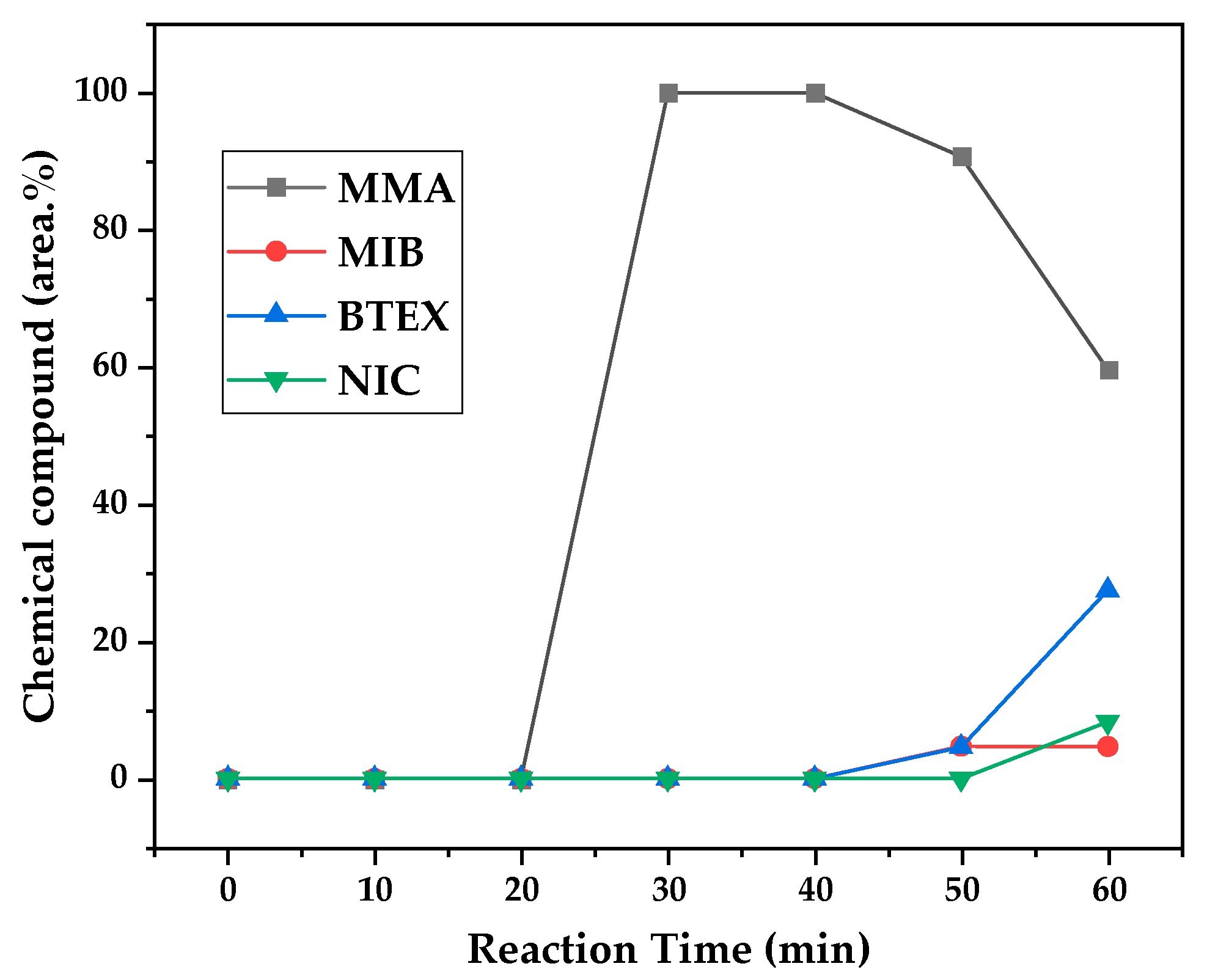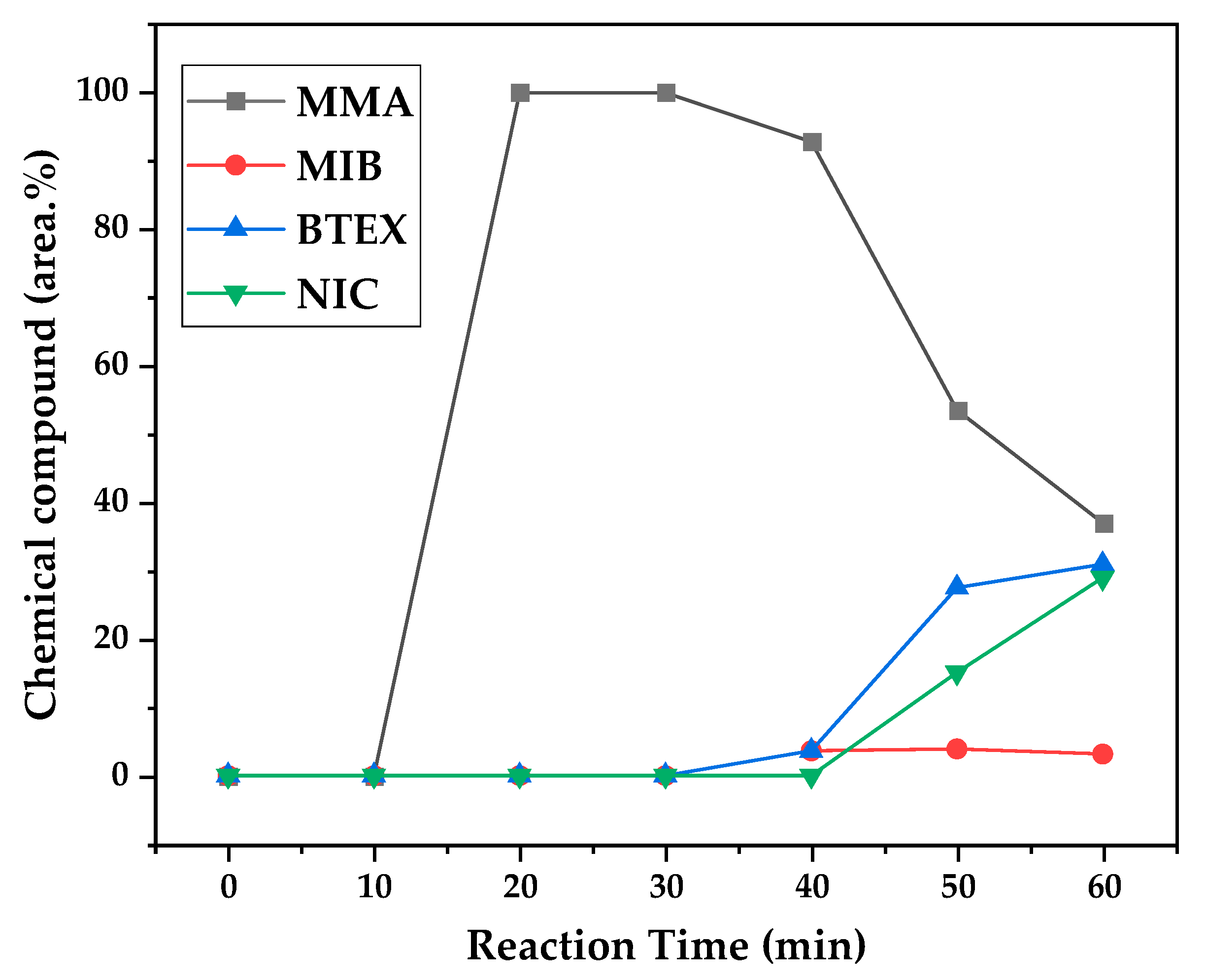 Table 2) for the liquid product of depolymerization, because toluene presents a higher value of kinematic viscosity than MMA. It does not explain why the acid value was ~2.0 mg KOH/g, since toluene is not an acid substance. We believe it to be due to the non-identified compounds, whose amounts start to be considerable near the end of reaction, along with BTEX compounds. Better separation needs to be conducted in order to identify the actual contaminants, since they seem to be aromatic compounds of high molecular weight. The sharp peak of MMA in the sample makes it difficult to distinguish other substances present, and maybe, the purification of the sample is needed in order to better analyze the minority compounds.