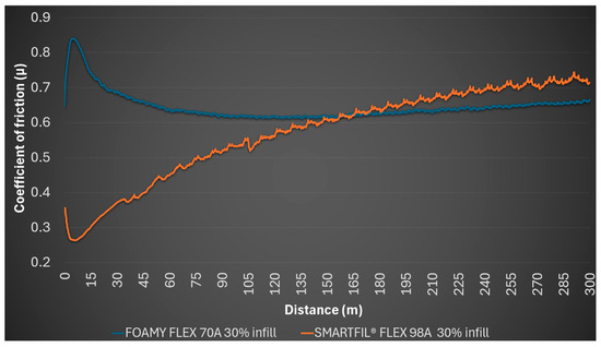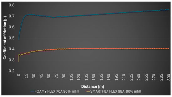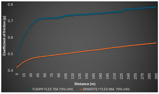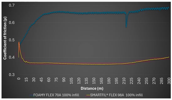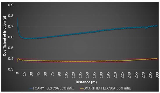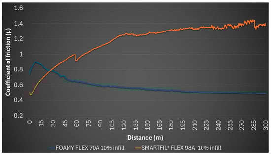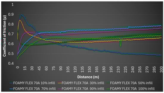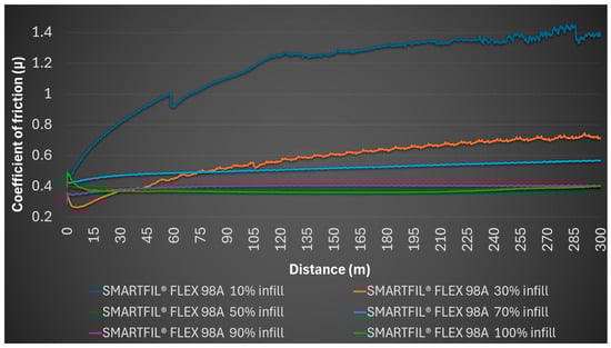 Figure 9 shows the evolution of the coefficient of friction for SMARTFIL® FLEX 98A with varying infill densities, complementing the results presented previously for FILAFLEX FOAMY 70A.