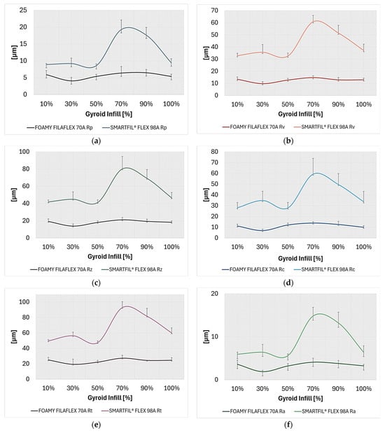 The surface characterization further elucidated the distinct SPP relationships of the two TPUs. SMARTFIL® FLEX 98A consistently presented significantly rougher surfaces than FILAFLEX FOAMY 70A across comparable infill densities. For SMARTFIL® FLEX 98A, roughness parameters such as Ra, Rq, Rz, and Rt increased substantially with increasing infill density. For instance, at 70% infill, SMARTFIL® FLEX 98A showed an average Ra of 10.74 µm compared to FILAFLEX FOAMY 70A’s 4.09 µm. This indicates that for SMARTFIL® FLEX 98A, higher infill leads to a more pronounced topographical variation, likely due to the nature of material deposition in FFF resulting in more distinct layer lines and structural features.