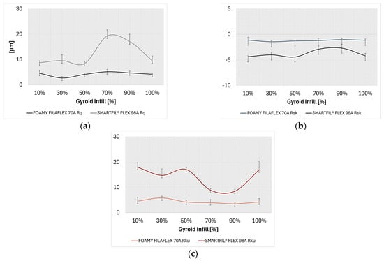 The material ratio parameters of FILAFLEX FOAMY 70A specimens at various gyroid infill densities are summarized in Table 6.