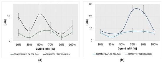 - Profile section height difference (Rdc), representing the effective depth of the functional surface profile, varied from 2.83 µm (30% infill) to 7.67 µm (70% infill).