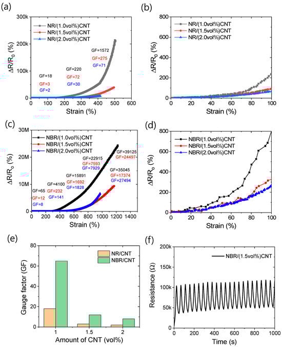 - Alam, M.N.; Kumar, V.; Lee, D.J.; Park, S.S. Styrene-Butadiene Rubber-Based Nanocomposites Toughened by Carbon Nanotubes for Wide and Linear Electromechanical Sensing Applications. Polym. Compos. 2024, 45, 2485–2499. [Google Scholar] [CrossRef]