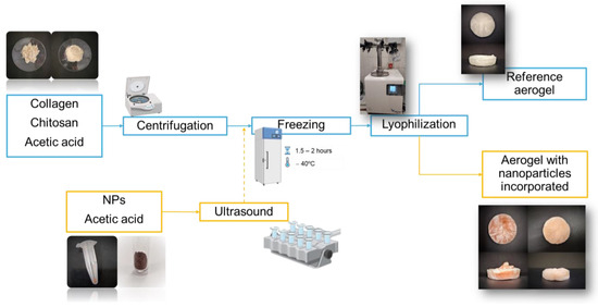 Figure 1. Synthesis of collagen–chitosan-based aerogel (reference system and systems with nanoparticles incorporated).