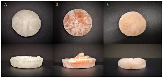 Figure 2 shows the macrostructural appearance of the elaborate aerogels. As can be seen, the reference system (AG-Ref, Figure 2A) exhibits a white coloration in accordance with its composition. Nevertheless, the incorporation of nanoparticles results in a change in coloration to orange. Thus, the incorporation of chemical nanoparticles (Ch-NPs, Figure 2B) or green nanoparticles (Gr-NPs, Figure 2C) results in the formation of an orange hue in the systems, with the Ch-NPs systems exhibiting a darker orange coloration. This darkening may be attributed to the larger size of the Ch-NPs, which allows for greater color prominence within the structure.