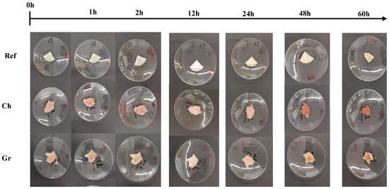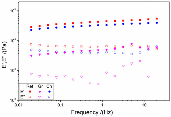 The results of the frequency sweep tests of the different systems are shown in Figure 3. It can be observed that the Ref and Ch systems exhibit modulus values (for both E′ and E″) that are practically stable at the entire frequency range studied. Nevertheless, the Gr system presents a slight variation in these values, particularly in E″. This behavior could be attributed to the inherently unstable nature of the Gr-NPs, which is a consequence of the presence of polyphenols during the manufacturing process. The polyphenols remain on the surface of the nanoparticles, thereby creating a system that is more unstable.