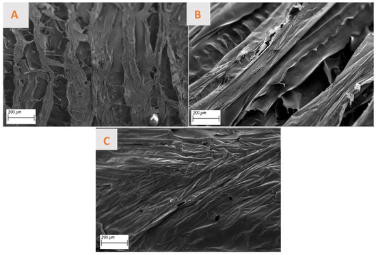 The micrographs of the three aerogels are presented in Figure 4. They show an irregular structure, characterized by the presence of micro- and macro-pores. The Ref and Ch aerogels show very similar laminar structures (Figure 4A,B), with a defined directionality. This may account for the minimal difference in modulus observed in the rheological study. The Gr aerogel also exhibits a laminar structure, but not directional, and displays greater heterogeneity (Figure 4C). The low values of the elastic and viscous moduli can be attributed to the lack of optimal stacking, as a result of the existence of a higher concentration of solids in the matrix that alter the morphology of the aerogels, promoting a minimization in the dimension of the pore opening as recorded in previous works [72,73]. In this sense, different works reveal that this irregular shape is typical of this type of material, forming an interconnected porous structure that is necessary for enhancing cell migration and the transportation of biomolecules [74,75,76]. This structure, which is composed of the superposition of different layers, may be linked to the gelation procedure that is needed for the formation of the aerogel by the lyophilization of a hydrogel [77].